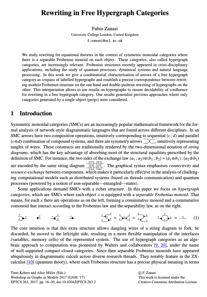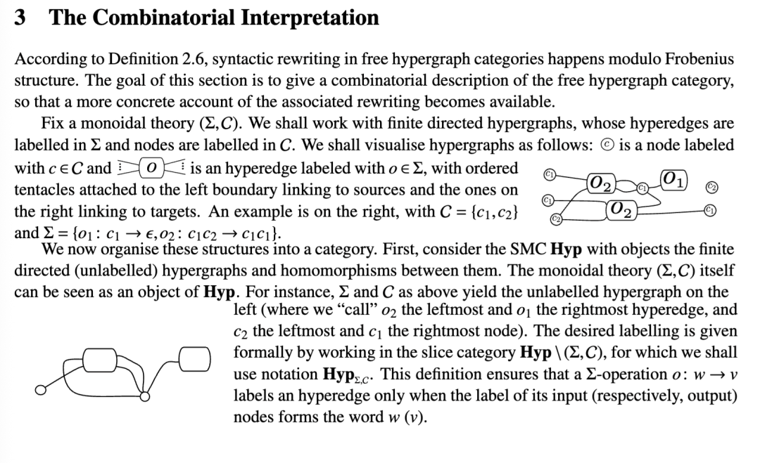我们描述了超图范畴中字符串图重写的一种可靠且完备的解释,将其作为超图的双推出重写,并展示了对于终止重写系统,它享有合流性的可判定性。这种方法的一个主要优势是,在组合模型中,由执行模 Frobenius 方程匹配所带来的挑战消失了。这在研究具有多个 Frobenius 单子的公理化时变得重要:这些现在都可以被视为结构方程并融入组合模型中,从而将合流性和终止性的问题局限于非 Frobenius 公理。我们理论的这一应用(我们计划在未来工作中探索)是推广 [2, 3] 框架的主要原因,后者仅能够吸收单个 Frobenius 结构。另一个有希望的方向是二分图的代数研究(例 3.5),这可能与分析基于这些结构的图形语言有关,例如生物代谢网络 [33]。