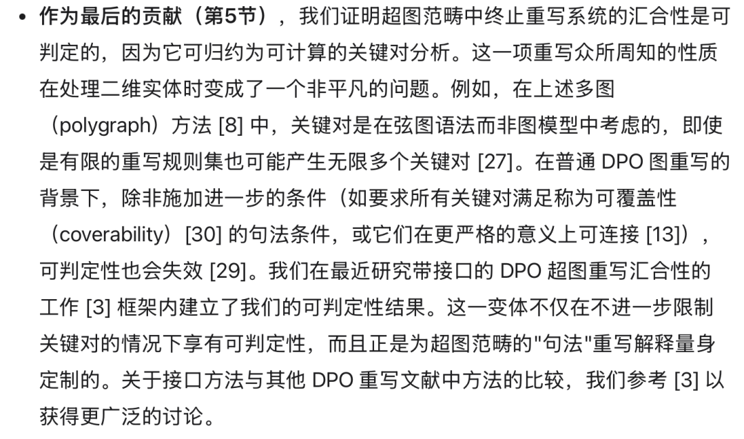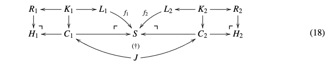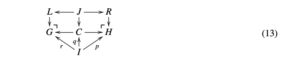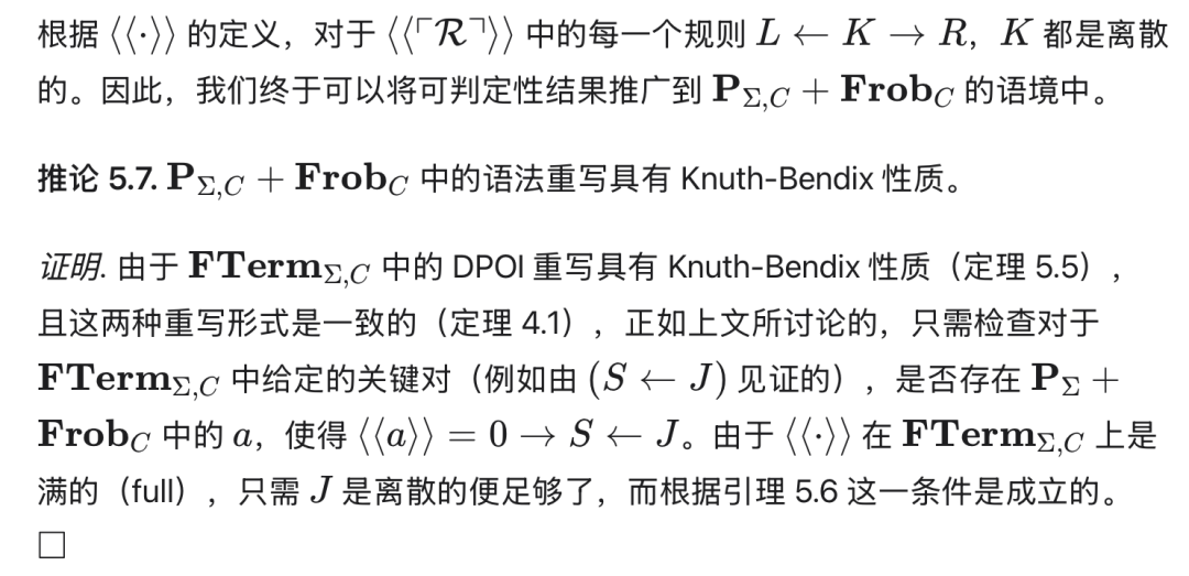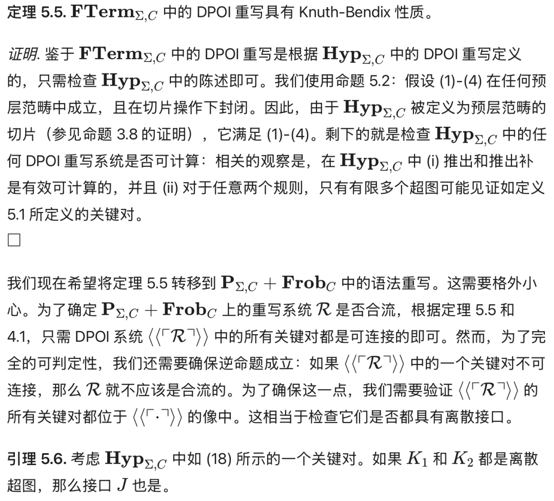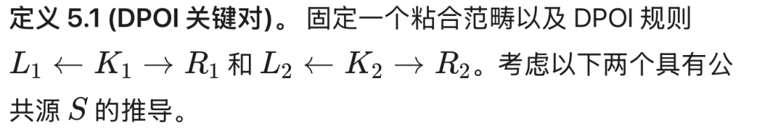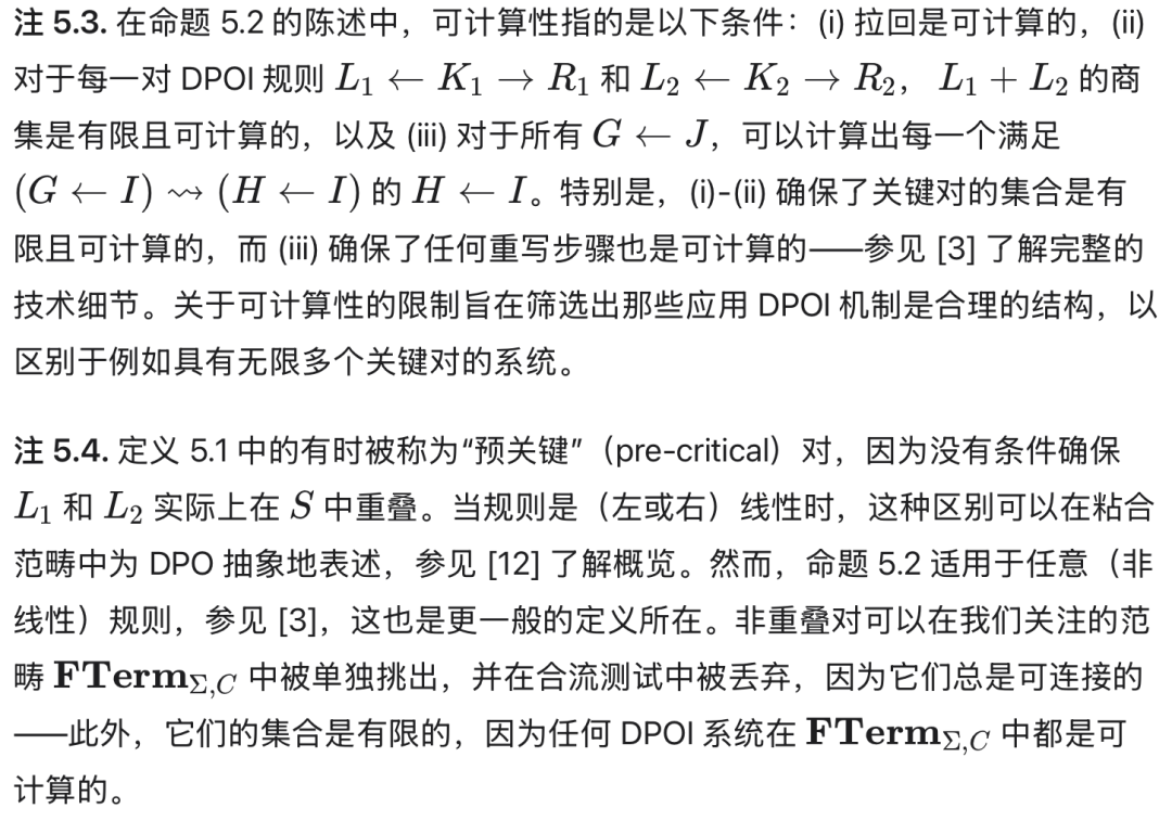 命题 5.2 ([3]). 假设 CC 满足以下假设:(1) 它有一个满-单分解系统(epi-mono factorisation system);(2) 它有二元余积、推出和拉回;(3) 它是粘合的(adhesive);(4) 所有推出在拉回下稳定。那么 CC 中的 DPOI 重写对于可计算重写系统具有 Knuth-Bendix 性质。