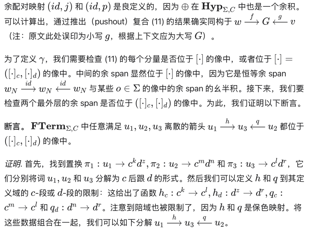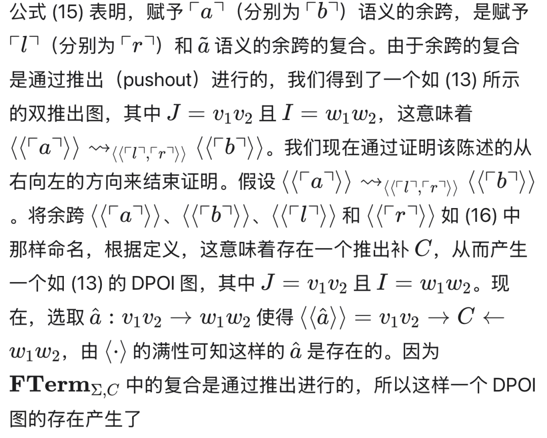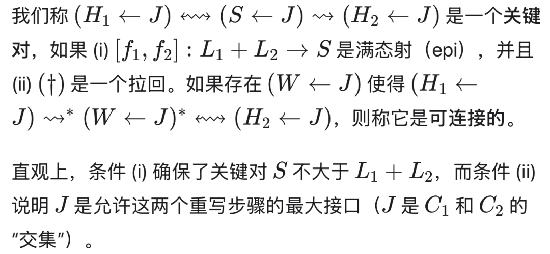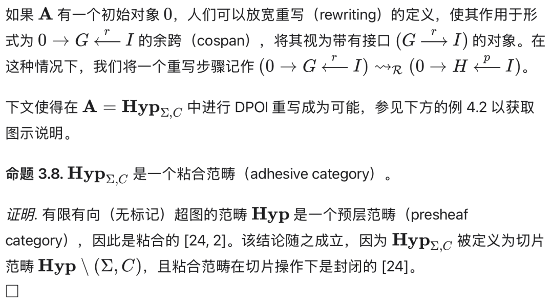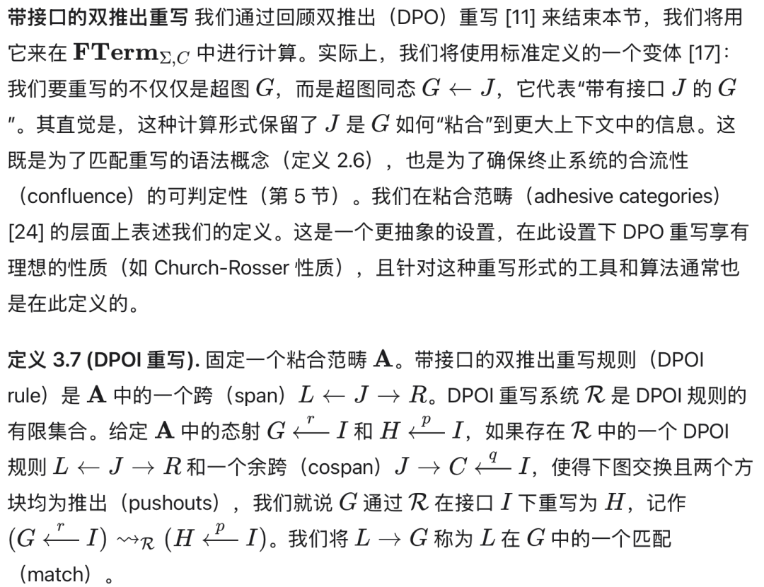 命题 5.2 ([3]). 假设 CC 满足以下假设:(1) 它有一个满-单分解系统(epi-mono factorisation system);(2) 它有二元余积、推出和拉回;(3) 它是粘合的(adhesive);(4) 所有推出在拉回下稳定。那么 CC 中的 DPOI 重写对于可计算重写系统具有 Knuth-Bendix 性质。