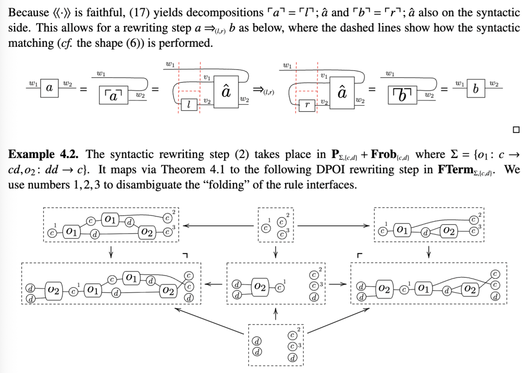 这与图示演算用户的日常实践是一致的,也是在证明辅助工具中实现图形推理的起点。存在一个关于幺半范畴重写的详尽数学理论,它将重写规则视为生成 2-胞腔(也被称为计算复合体(computads)[21] 或多图(polygraphs)[8]),并将可能的重写轨迹视为复合 2-胞腔。然而,这种抽象视角在涉及实现重写时并不能提供直接的帮助。主要的挑战是对匹配(matching)的具体理解:为了检测一个弦图是否包含重写规则的左端,人们需要根据结构方程考虑其所有可能的分解。在超图范畴中,这等同于说重写是模(modulo)可分 Frobenius 幺半群的方程发生的。例如,重写规则
