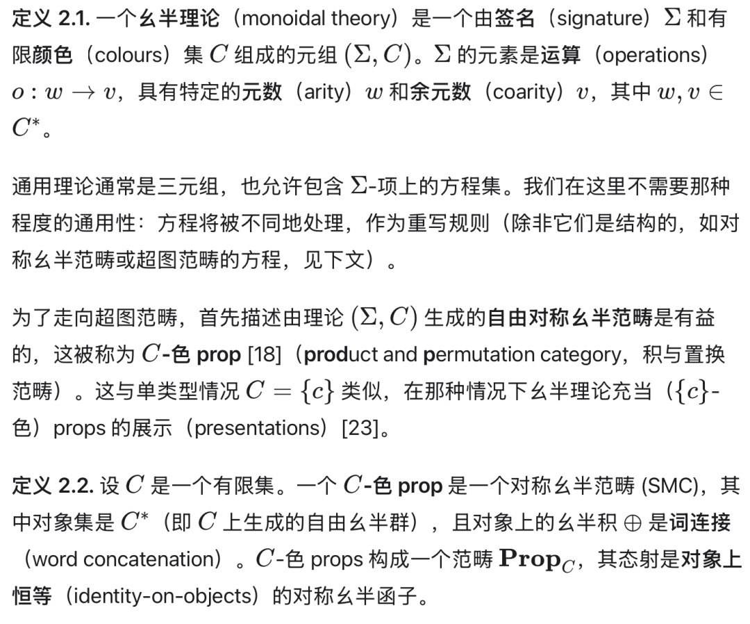 我们将研究由操作签名(signature of operations)自由生成的超图范畴。以下是适用于幺半语境的概念。