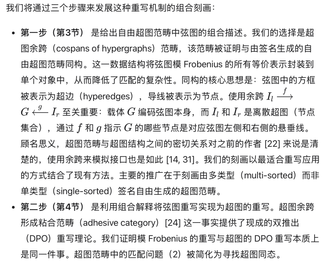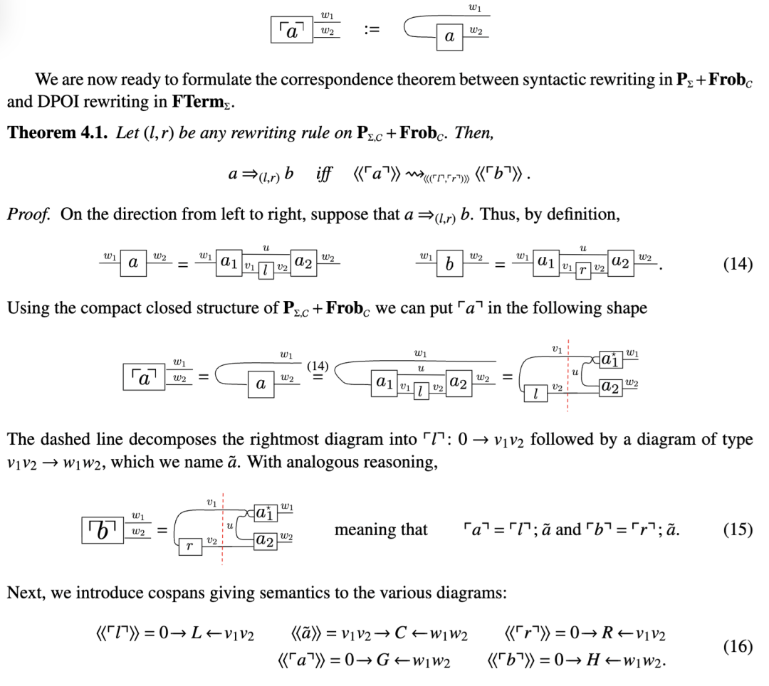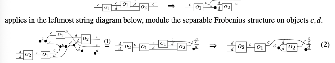 虽然可分 Frobenius 幺半群构成了上述方法的共同核心,但在每个应用中,弦图还会被特定领域的方程进一步商(quotiented),这对于定义系统的适当行为等价性概念至关重要。本文的观点是承认一方面对称幺半结构和 Frobenius 结构(这是任何超图范畴的内置部分)与另一方面特定领域方程之间的概念差异。我们将把后者作为重写规则来研究:如果这样一个方程的左端可以在一个更大的弦图中找到,它就可以被删除并替换为其右端。