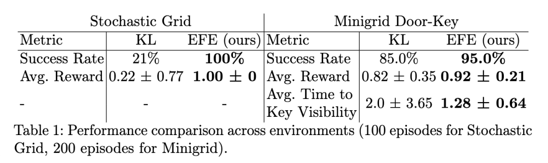 Minigrid门-钥匙环境 我们在200个实验回合中评估了两种智能体,规划时域为25步。表1(右)展示了在Minigrid门-钥匙环境中,最小化EFE的智能体与KL控制智能体之间的定量比较。