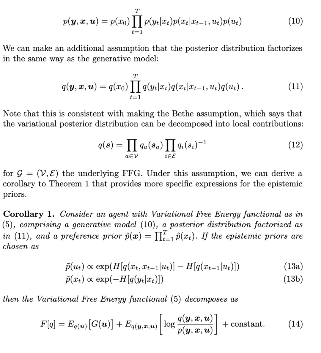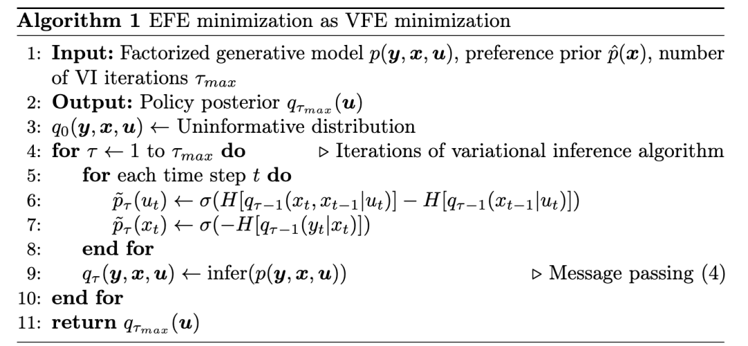 最近,[15]提出了一种期望自由能最小化的替代方法,将EFE最小化构建为一个常规的变分自由能最小化任务。这种方法对于可扩展地实现EFE最小化规划算法很有前景,但仅提供了理论说明,未考虑实际实现或实证验证。在下一节中,我们将提出该方法的一个消息传递实现。