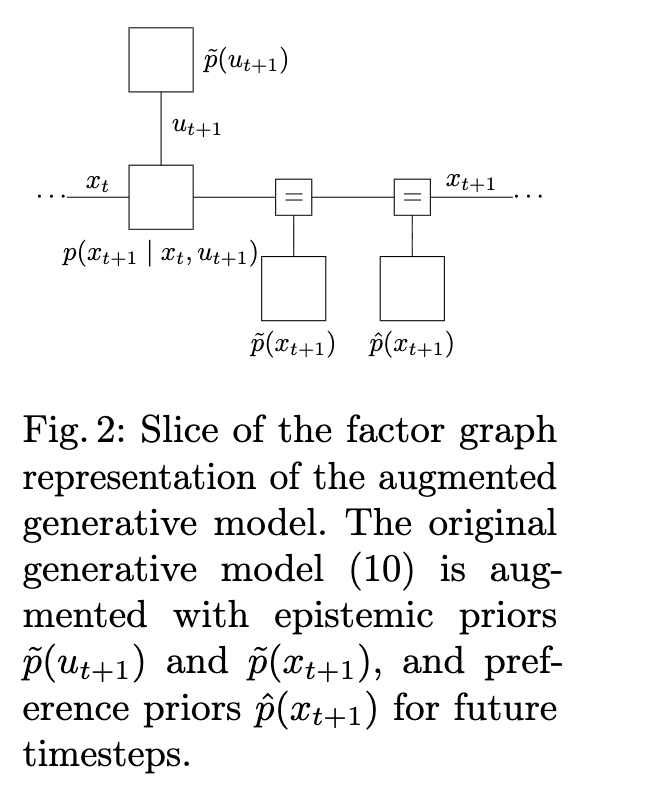 虽然该推论是定理1的一个特例和直接应用,但其详细证明在附录A中给出。该推论表明,偏好先验和认知先验可以归结为局部贡献。我们将把偏好先验和认知先验实现为因子节点,在推理过程中充当先验分布。图2展示了增强后的因子图的一个时间片。