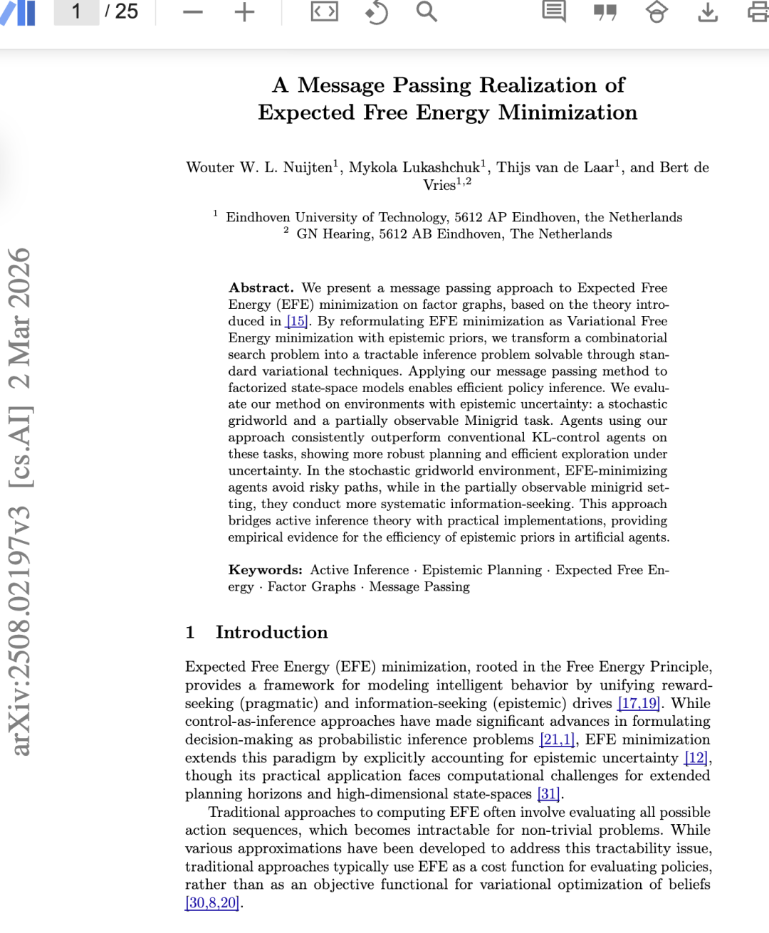 通过将EFE最小化重新表述为变分推理,我们的工作有助于将自由能原理和主动推理的理论框架与不确定性下决策的实际实现相统一。这架起了智能行为理论解释与人工智能体高效算法之间的桥梁,为在复杂和不确定环境中平衡实用目标与认知目标提供了一种原则性的方法。
