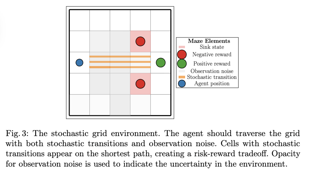 存在一条更长但更安全的路径,可以避开所有随机转移。对于风险感知的智能体来说,最优策略是走这条更安全的路径,尽管这需要更多步数。该环境的可视化如图3所示。