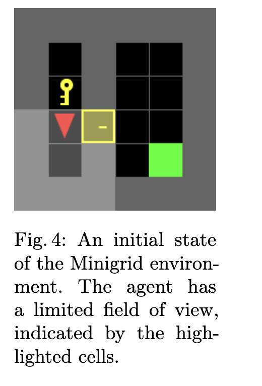 Minigrid门-钥匙环境 我们考虑的第二个环境是一个Minigrid环境,具体是一个4x4的门-钥匙环境。该环境测试了认知不确定性的另一个方面,即部分可观察性。智能体的视野有限,这意味着它必须主动探索以减少对环境状态的认知不确定性。