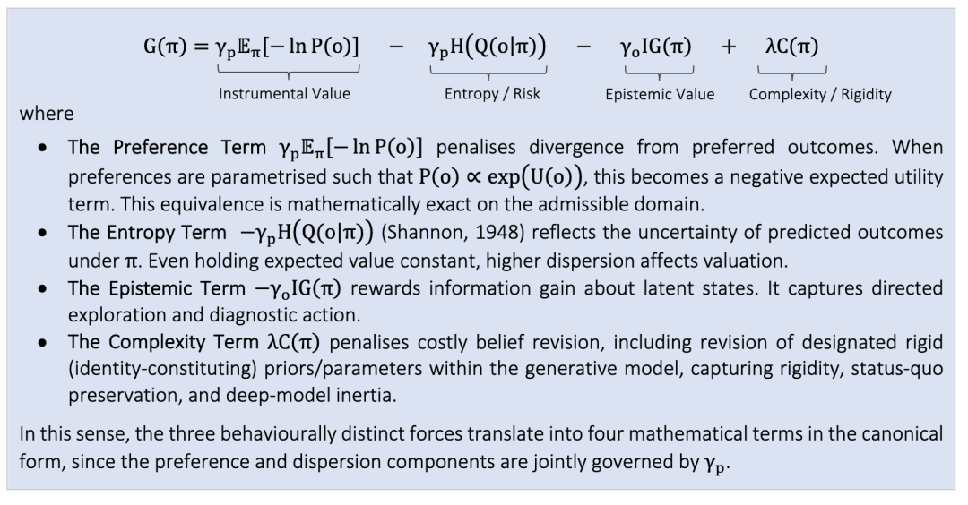 重要的是,该框架并不声称从第一原理推导出偏好、价值或身份。偏好作为关于结果的先验信念进入生成模型,这在形式上等价于引入一个效用函数。因此,其进步在于将效用置于与认知成本和复杂度成本相同的信息尺度上,从而允许在单个变分目标中处理这些权衡。