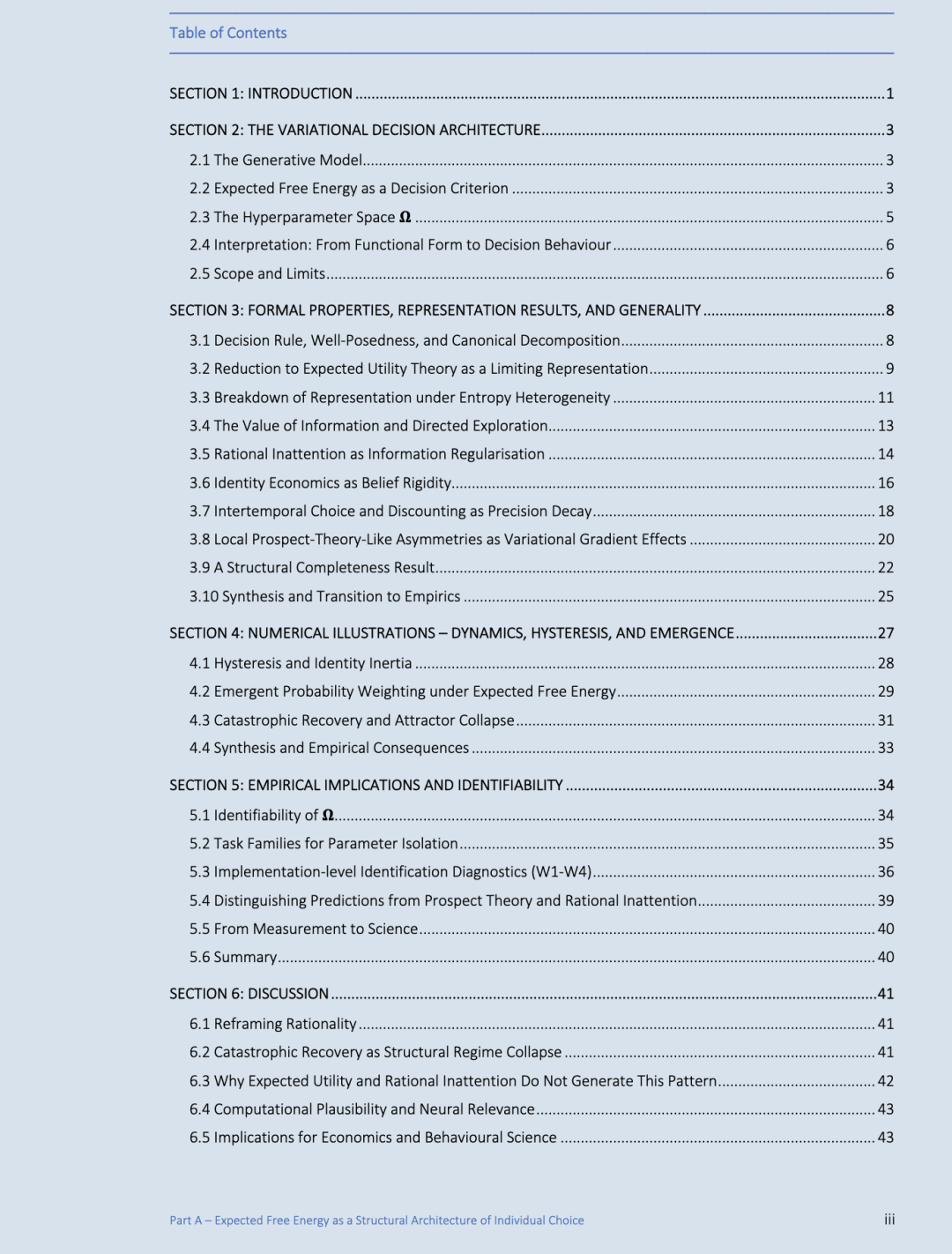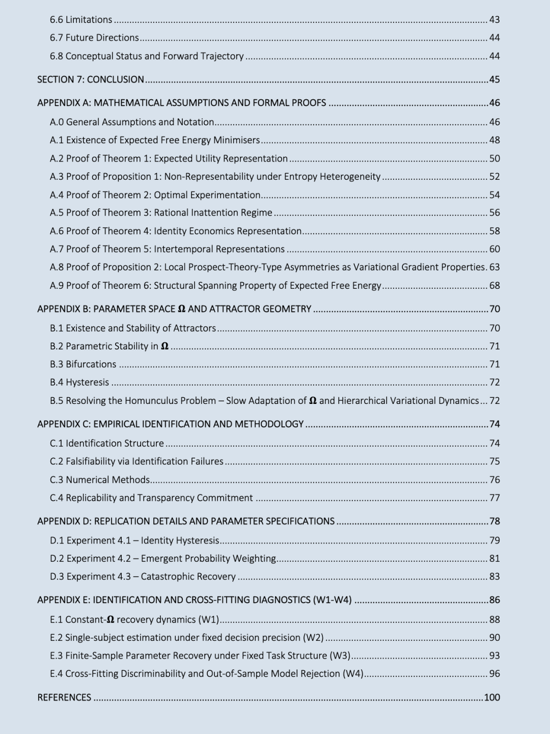 第 3 节现已确立了以下核心结果。首先,在附录 A.0 陈述的维持正则性假设下,预期自由能定义了一个数学上适定的决策规则。其次,期望效用在可识别的结构性限制下作为一种精确的极限机制出现,且这种等价性在熵异质性下会破裂。第三,鉴于 3.4–3.8 小节中指定的相应假设集,理性疏忽、身份经济学、跨期折现以及类前景理论的不对称性作为符合规律的内部案例出现。第四,在由 (SC1)–(SC5) 界定的类别 JJ 内,第 3 节表明预期自由能在由假设集 3.9 定义的域内跨越了一类广泛的贝叶斯控制架构。