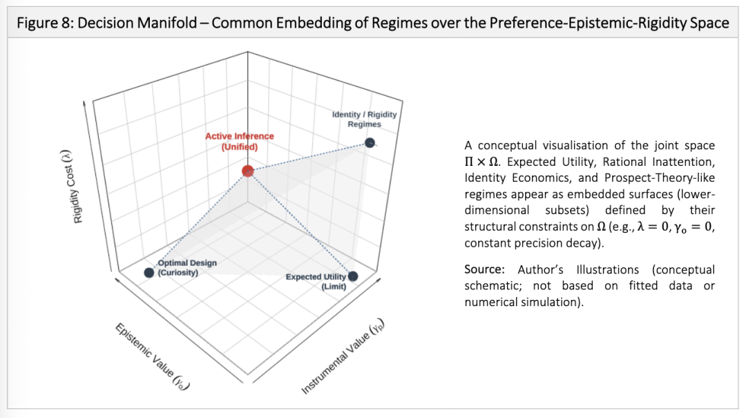 这一完备性结果暗示了一种共同的几何嵌入,如图 8(决策流形)示意所示。因此,每个经典理论占据了由策略集 ΠΠ 和超参数向量 Ω 定义的高维空间中的特定机制区域。它们是在由 (SC1)–(SC5) 定义的结构域内,单一变分目标的替代参数化形式。