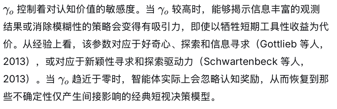 按照标准公式表述的经典期望效用最大化者属于被动学习者(Lindley,1956;DeGroot,1970)。如果信息是免费的,他们会处理信息,但标准效用函数不包含寻求信息的内在驱动力。相比之下,搜索理论(Stigler,1961)、最优实验文献(例如,Lindley,1956)以及主动推理中的理论公式(Schwartenbeck 等人,2013)认识到,智能体会主动探索以减少不确定性。在预期自由能中,这种驱动力内生于决策泛函本身。认识项(−γoIG(π)因此明确奖励那些能够解决关于环境状态不确定性的策略。这为与工具性偏好并行运作的好奇心和探索提供了一个形式基础。