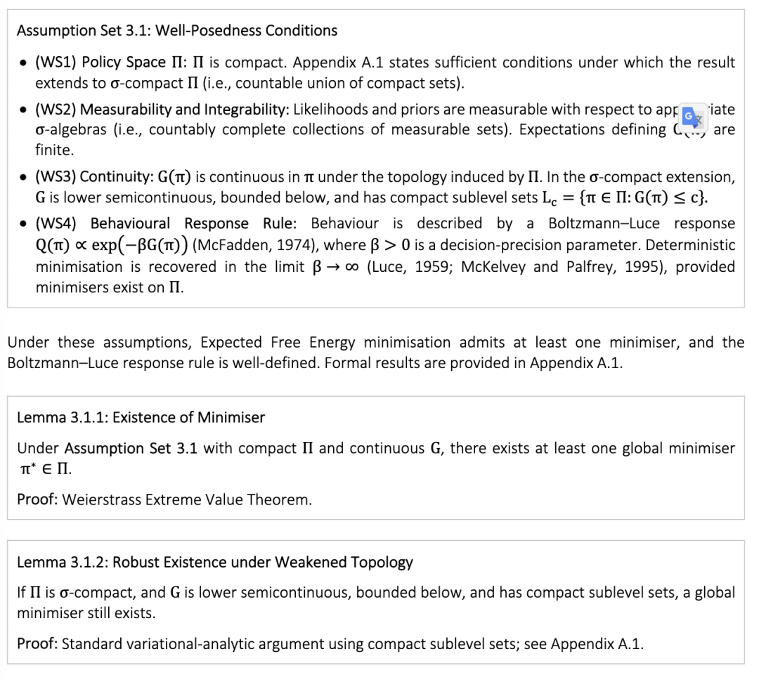 我们首先证明,在维持的正则性假设下,预期自由能最小化定义了一个数学上适定的决策规则。然后我们证明,在可识别的结构性限制下,经典理论作为可容许域 Π∗上的精确特例出现,并且在同样清晰的结构性松弛下,这些等价性会破裂。与 (Amari, 2016) 一致,目标是进行结构性定位,以识别变分空间中经典表示有效的精确区域。目的是将现有理论置于一个具有显式边界的共同信息结构上 (Amari, 2016),扩展主动推理文献中已经存在的解释(另见 Parr 和 Friston,2019)。