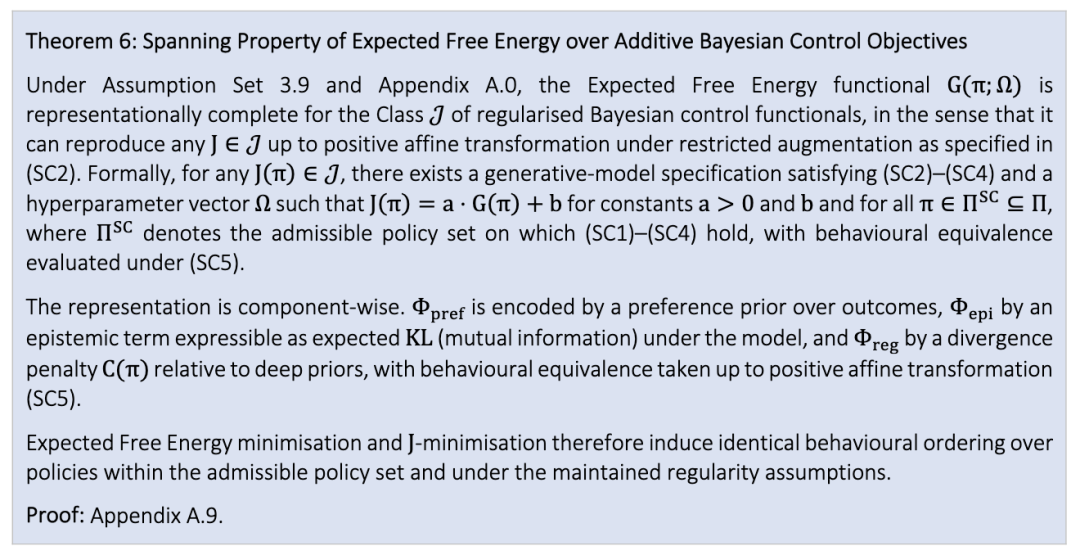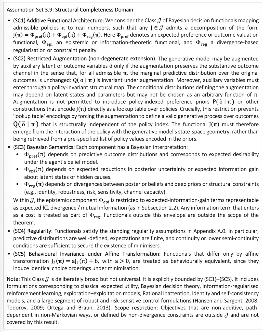 起点是结构性的。经济学、认知科学、控制理论和人工智能中的许多决策模型可以表述为工具性偏好泛函、认识性或信息论分量、以及基于散度的正则化或约束项的加性组合(Tishby 和 Polani,2011;Ortega 和 Braun,2013)。预期自由能(EFE)本身已确切具备这一架构。因此,随之而来的问题是,这种对齐能否在一个明确指定的结构域内被形式化为一个完备性陈述。构建这样一个完备性主张需要固定它所适用的目标域。因此,我们将关注范围限制在具有偏好、认识性和散度正则化分量的加性贝叶斯控制泛函上,并假设其满足标准正则性条件和非退化增强规则。