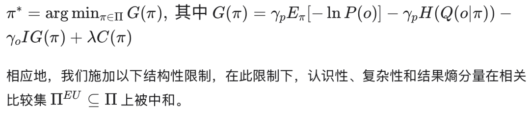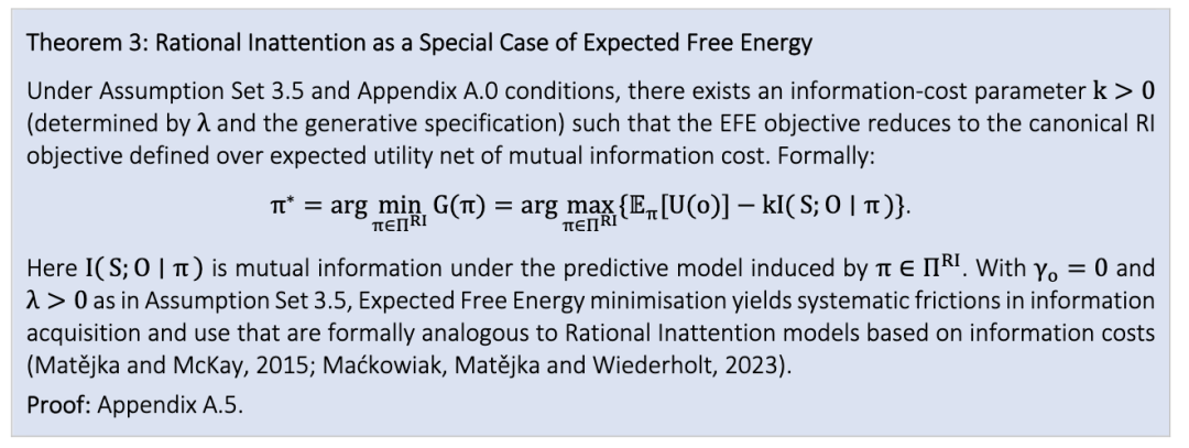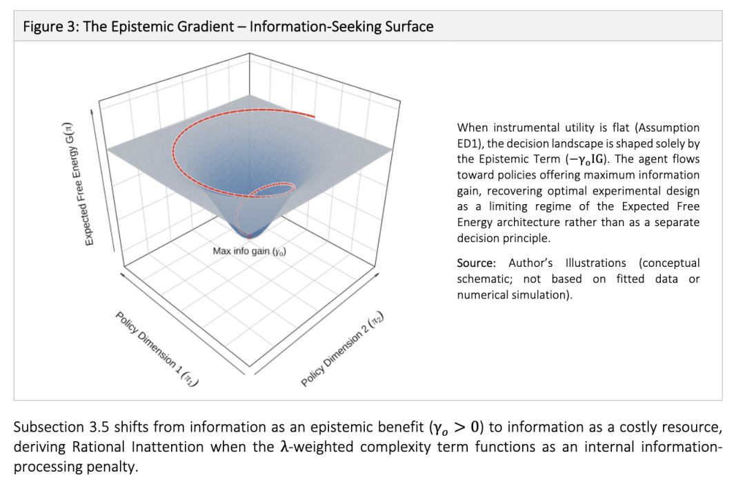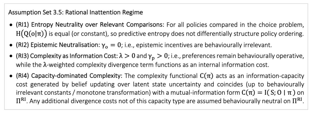 在这些约束下,认识激励被中和,且熵不会对策略选择产生差异性结构化影响。唯一剩余的非中性梯度是由作用于灵活信念表征的 λλ 加权复杂度项产生的。因此,复杂度项作为一种内部信息成本获得了行为意义。这正是理性疏忽模型被定义其中的结构包络。由此可得: