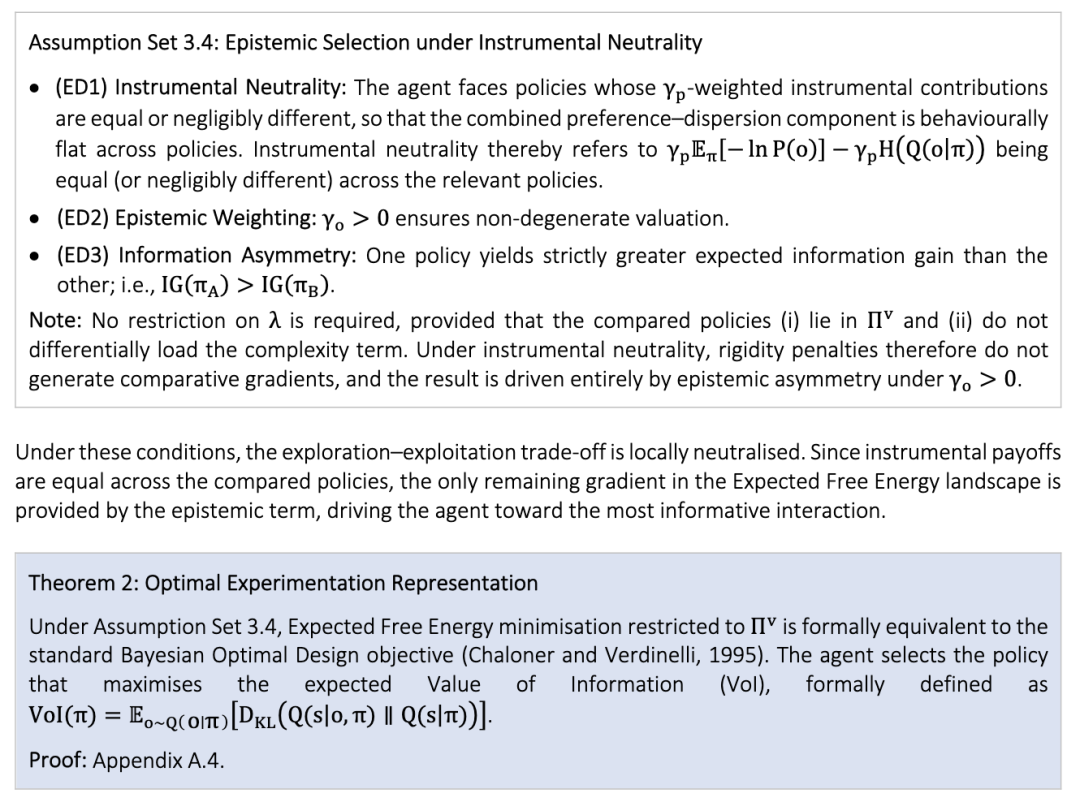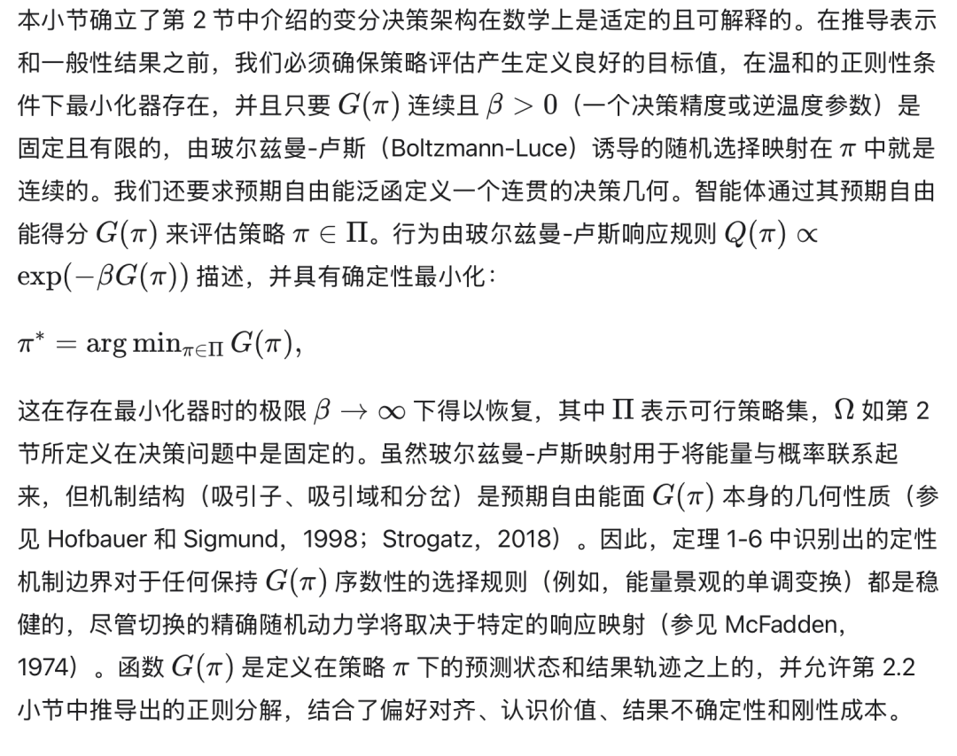 解读: 在前述存在性和连续性条件下,该变分架构在广泛的一类环境中产生了确定且可解释的选择预测。2.2 小节引入的正则分解确保了后续结果能够分离出选择性地中和或激活特定结构分量所产生的行为后果,而不是引入新的基本要素。诱导出的决策动力学表现出稳定不动点和吸引子结构的形式条件在附录 B 中有详细说明。3.2 小节现在直接建立在这一基础之上,通过确立预期自由能何时坍缩为经典期望效用理论,以及何时不发生这种情况。