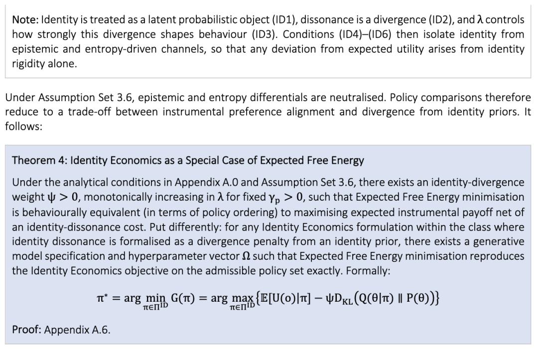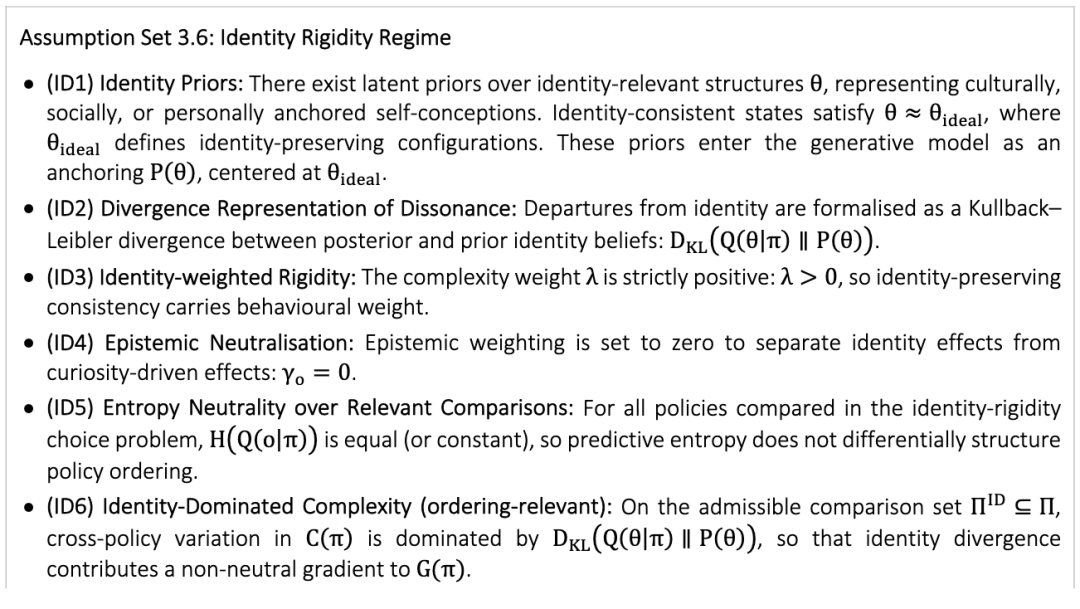 解读:这一结果将身份视为一种潜在的概率先验,将身份失调视为一种散度。同时,保护身份免受收益最大化影响的行为并不意味着非理性,而是表明占据了 Ω 空间中散度成本在结构上占主导地位的区域。因此,牺牲工具性收益以维护身份的行为在变分意义上是理性的。它最小化了相对于一个生成模型的预期未来惊奇,该生成模型联合编码了智能体及其环境,且条件于固定的身份先验。在这个精确的意义上,如果世界具有假设集 3.6 中规定的结构形式,那么身份经济学可以被视为预期自由能所简化的机制。反之,当这些结构性条件失效时,身份经济学未必是恰当的极限描述。
