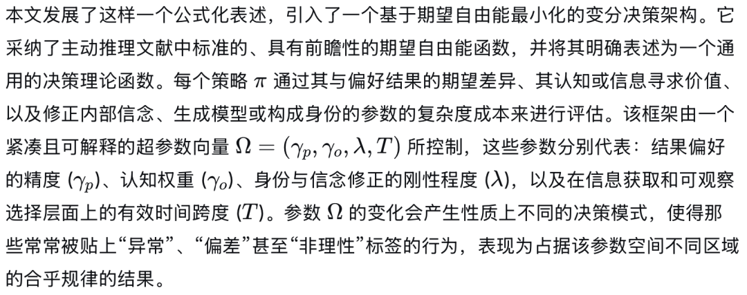 本文的核心贡献在于表明,期望自由能提供了一种变分决策架构,在该架构下,期望效用、理性疏忽式的信息正则化、基于身份的刚性,以及类前景理论的局部不对称性,都表现为同一决策架构内数学上定义明确的极限情况。本文进一步展示了不同的行为“表型”如何对应于期望自由能图景中定义明确的区域,从而能够以精确的数学术语表述决策模式以及策略选择中的质性转变。随后,本文提供了数值示例,显示系统性地变化 Ω如何引发策略选择和持续性现象(包括锁定和类似恢复的动态)中的质性转变。最后,本文给出了明确的识别结果,并提出了可经验实施的实验设计,这些设计能够估计 Ω,并基于跨情境约束和动态预测,将该框架与前景理论及其他主流决策模型区分开来。