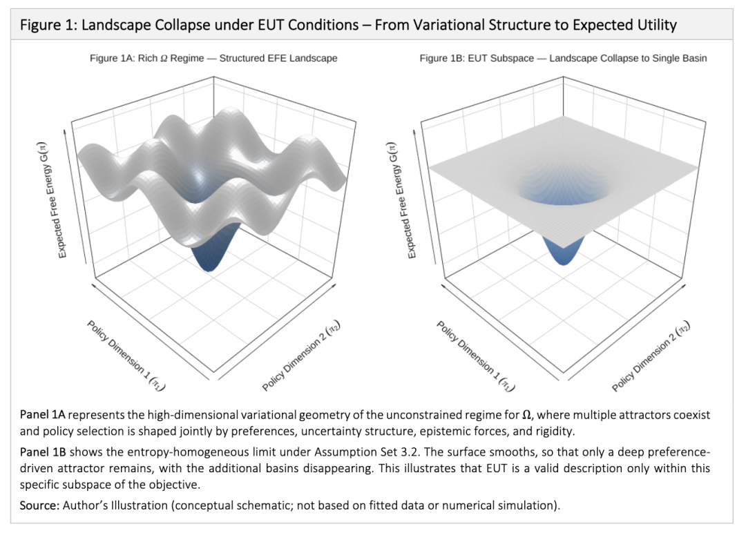 重要的是,本文并未否定期望效用,而是将其识别为一个更广泛变分结构中数学上定义明确的极限情况。正如我们将要证明的,在假设集 3.2 的结构条件下,当认知激励、信息结构或身份刚性被抑制时,期望自由能会退化为期望效用。然而,当这些要素成为环境的结构性特征时,期望效用表示作为一种在维持的信息结构下的策略排序表示,在形式上是不完整的,而不仅仅是描述上的不准确。因此,本文的一个贡献在于,明确了效用最大化在表示上具有充分性的结构条件,以及其不具有充分性的条件。在这个意义上,本文的目标并非取代经典理论,而是将其定位,精确地指明它在哪些情况下是正确的,在哪些情况下是沉默的,以及为何如此。