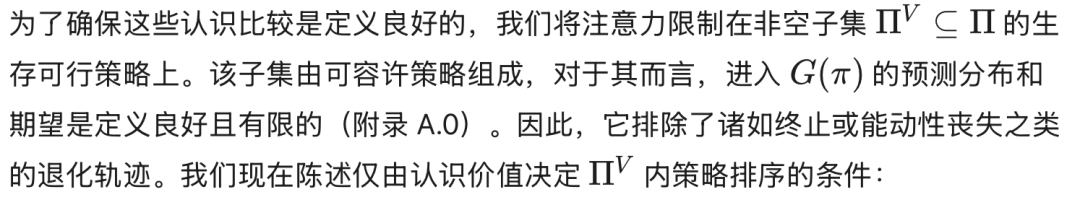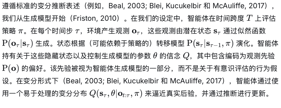 因此,在本 A 部分中,变分架构被解释为一个计算层面的刻画,而非关于有意识思考的主张。策略空间 Π表示由智能体的生成模型所支持的行动轨迹库,包括习惯性的、情感性的、启发式的以及反射性的反应。同样,感知和信念被建模为概率性的且易错的,允许非真实的表征、认知上的不完整性,以及对可用选项的有限意识。因此,期望自由能是一个计算性的决策原则,旨在将反思性行为和直觉性行为都包含在同一个形式体系内。