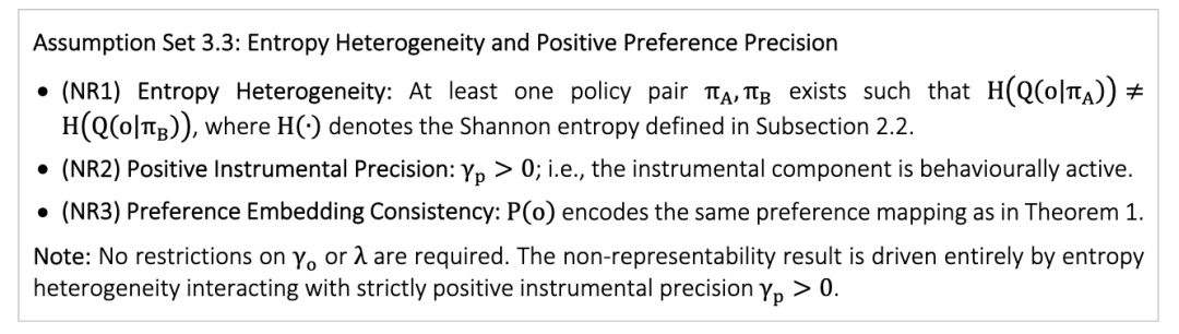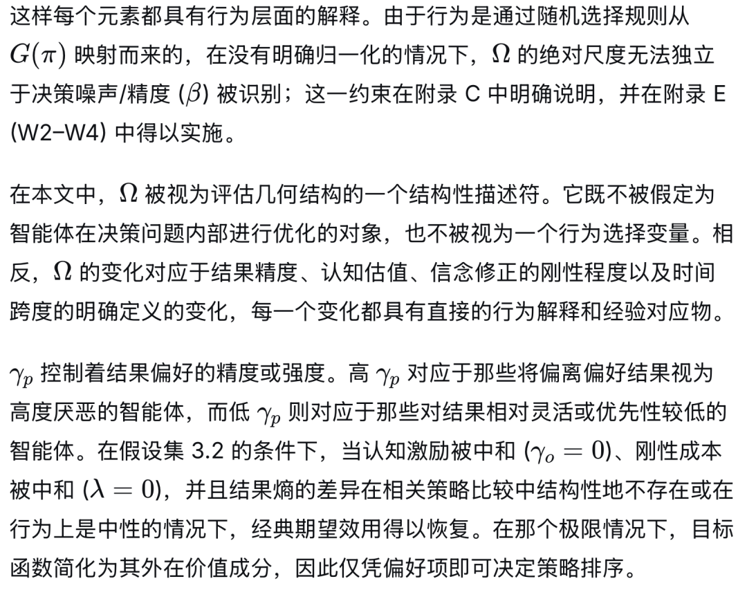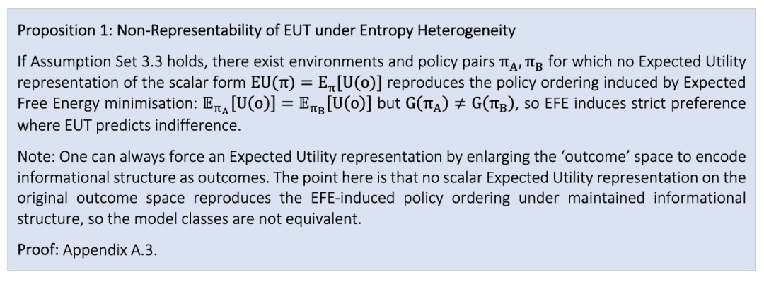 解读:在假设集 3.2 的结构条件下,预期自由能在可容许域 Π∗ 上坍缩为期望效用,且没有额外的结构在行为层面保持有效。这种等价性是结构性的,因为它定义了一个精确的边界。在熵齐性、认识中性和无复杂度的环境中,经典效用最大化在形式上是充分的。在此边界之外,它通常在信息上是不完整的,因为决策问题的额外结构特征变得具有行为后果,且无法在标量期望效用泛函中表示。这对 3.3 小节至关重要,因为放松熵齐性并非在宽泛的意义上“增加现实性”。相反,它改变了模型必须能够表示的内容。