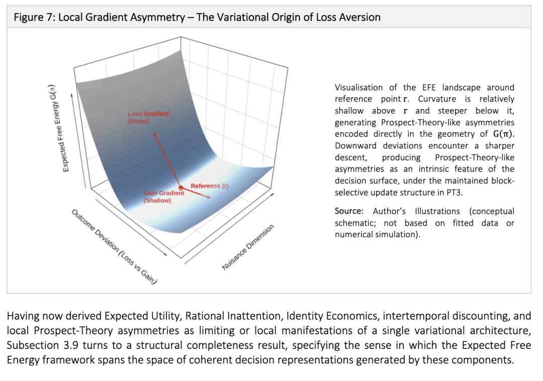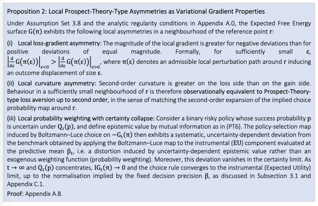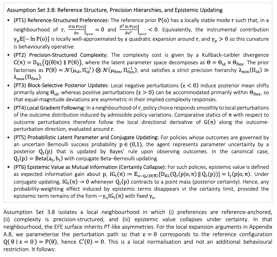 解读:前景理论类型的行为被重构为一种优化响应,发生在违反高精度身份先验在结构上比在低精度、灵活的信念维度内进行调整代价更高的环境中。λ 加权复杂度项并不编码外生的不对称性。相反,这种不对称性内生地源于生成模型的层级精度结构。因此,在假设集 3.8 下,损失厌恶和概率加权作为预期自由能表面的局部几何性质涌现,而非作为对价值函数的强加扭曲,并且它们是局部的(而非全局的)主张, tied to (绑定于) (PT1)–(PT4) 成立的邻域(并且,对于概率加权分量,(PT5)–(PT6) 也成立的区域)。