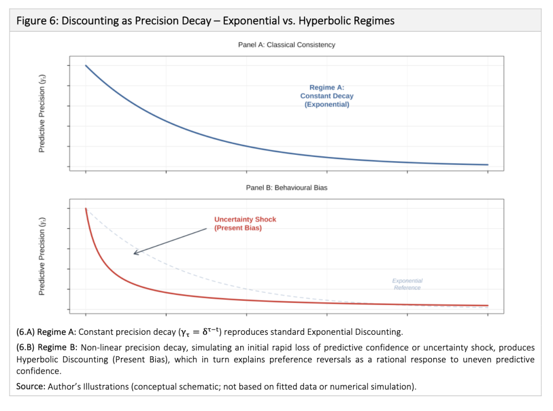 如图 6(折现机制)所示,当时间精度以恒定速率衰减时,会出现标准的指数曲线;而当精度在紧接着的下一步急剧下降随后趋于平缓时,则会出现当前偏差模式。在这两种情况下,跨期选择行为都是时间精度轮廓 γτ 在期望效用上的投影,而非一个独立的偏好参数。