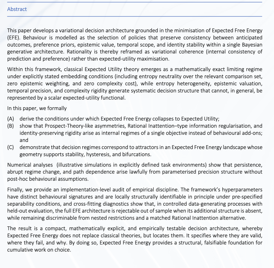 其结果是一个紧凑、数学显式且实证可检验的决策架构,在此架构中,预期自由能并非取代经典理论,而是对它们进行定位。它指明了这些理论在何处有效、在何处失效以及原因何在。通过这样做,预期自由能为关于选择的累积性工作提供了一个结构性的、可证伪的基础。