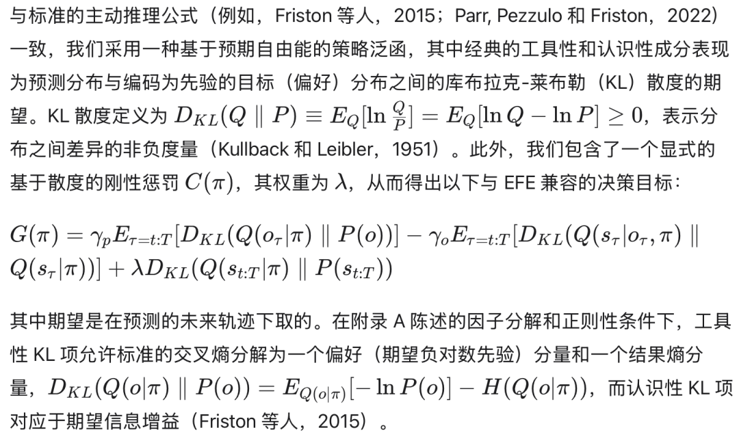 第一项随后量化了预测结果与偏好结果之间的期望散度。如果一个策略预计会产生与智能体偏好不一致的观测值,它将受到惩罚。第二项是关于潜状态的期望信息增益(Lindley,1956)(Cover 和 Thomas,2006;Friston 等人,2015)。由于它以负号进入,最小化 G(π) 有利于具有更高期望信息增益的策略。前两项共同对应于预期自由能的标准语用和认识成分(Friston 等人,2015)。
