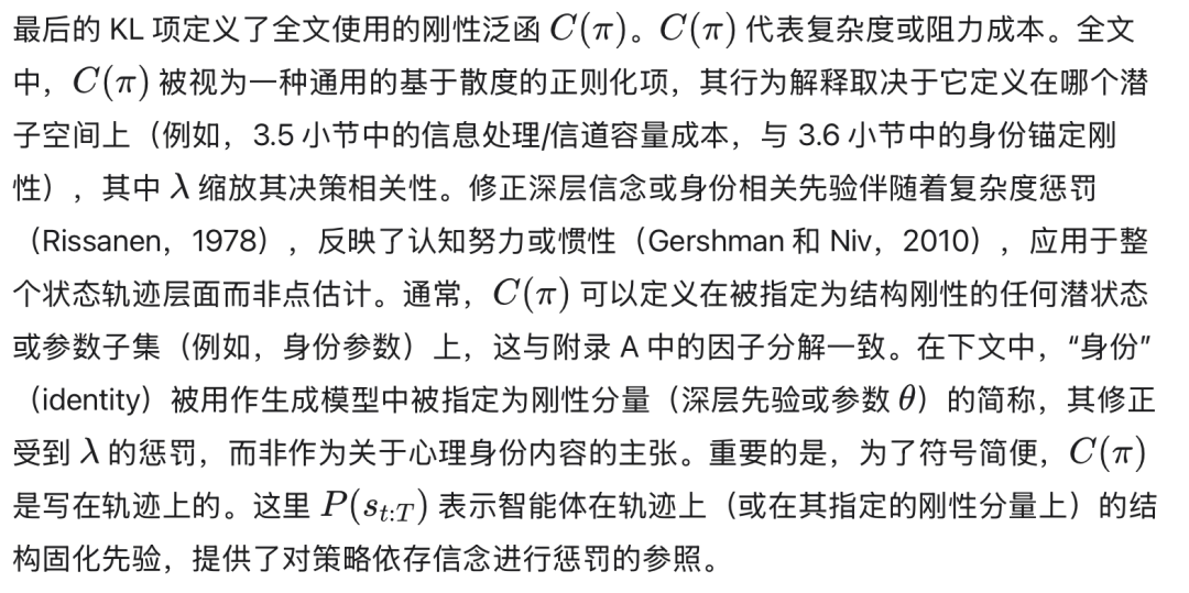 λ捕捉了深层信念、模型或构成身份的先前所固有的刚性。它调节了深层先验在多大程度上抑制对新出现的、矛盾的证据的吸收。较高的 λ会对信念修正施加惩罚,使得智能体更倾向于那些能维持根深蒂固的表征承诺(深层先验/指定的刚性参数)的策略,即使这些策略需要付出工具性成本。当 λ较低时,智能体能够灵活地根据新证据调整信念,相对轻松地重新配置身份和内部模型。在神经生物学上,λ可以与精度控制(Feldman 和 Friston,2010)以及常在认知控制框架下讨论的自上而下的约束机制(Miller 和 Cohen,2001)联系起来。在行为层面,λ支撑了诸如身份保护性认知(Akerlof 和 Kranton,2000)、信念持久性(Nickerson,1998)以及习惯性或病理性行为模式的持续性(Wood 和 Neal,2007)等现象。λλ是反映稳定的特质、缓慢适应的状态,还是制度性约束,这一点在本节中不作明确界定,将在第 5 节中讨论。