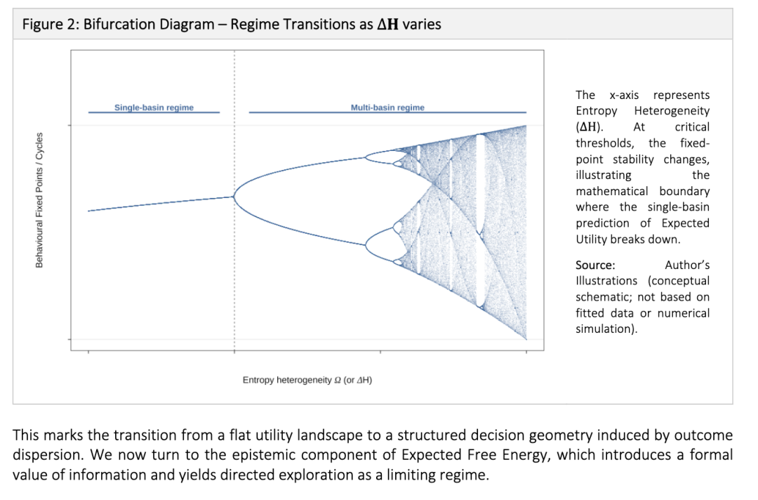 这种分歧在形式意义上是几何性的。图 2(分岔图)阐明,随着环境偏离熵齐性,作为期望效用特征的单一稳定吸引子失去了全局最优性。多个稳定吸引域随之涌现,行为开始追踪环境日益丰富的信息结构。因此,经典效用表示只有通过跨环境重新定义效用,而非通过单一稳定泛函,才能模仿这种行为的局部切片(参见附录 B.3 以获取形式拓扑分析)。
