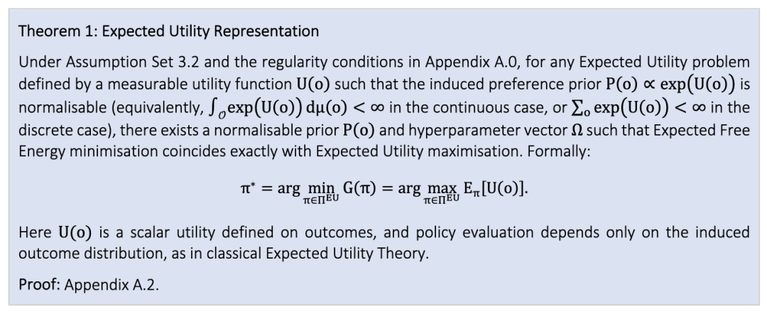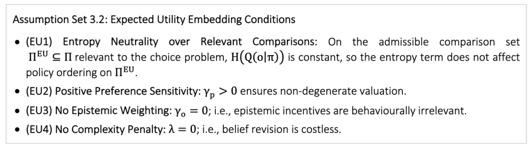 这些条件定义了没有比较不确定性结构、没有学习内在价值、且没有信念修正结构成本的环境。在此类环境下,只有工具性偏好分量保持有效。期望效用理论,正如 von Neumann 和 Morgenstern (1944) 以及 Savage (1972) 所形式化的那样,随后被恢复为预期自由能最小化的一个精确极限情况,当认识激励、不确定性结构和复杂度惩罚在行为上是中性的时。