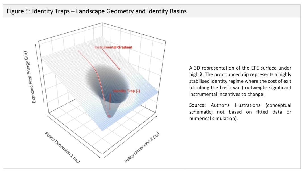 该框架有助于解释那些在仅关注收益的模型中显得令人困惑的持续性模式,包括稳定的社会规范以及对教条承诺的信念坚持(Rabin,1998)——这些抗拒修正,以及持续的身份自我概念(Bénabou 和 Tirole,2016)——这些将行为锁定在狭窄的轨迹中。在每种情况下,“身份”构成了对 θ 的散度惩罚。附录 B.4 形式化了由此产生的几何结构和滞后效应,这些效应使得退出身份机制比进入它更难。图 5 阐明了由此产生的“身份陷阱”。