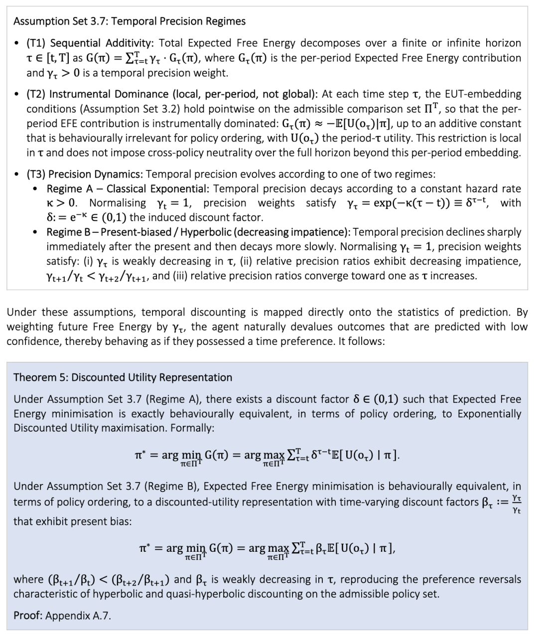 在本文讨论的变分框架中,折现是预测精度随时间衰减的后果。智能体依据其对未来自身生成预测所赋予的置信度来权衡未来的预期自由能。如果时间精度发生衰减,那么对 G(π)的未来贡献就会被降权,智能体从而表现出折现行为。这种衰减的形态决定了跨期选择是表现为经典的指数形式,还是行为上的当前偏差形式(以每期工具性主导为条件)。为了使这一映射精确化,我们将注意力限制在一个非空的可容许比较集