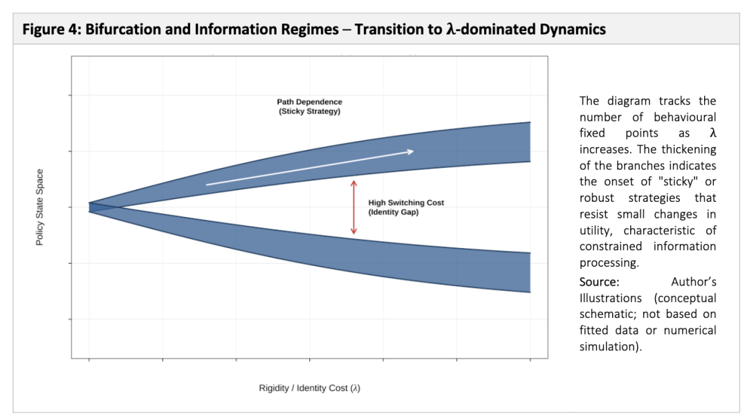 重审图 2 中引入的分岔图,图 4(信息机制)阐明这一转变是结构性的。随着复杂度成本 λ 的增加,系统从效用主导行为转变为信息正则化动力学。策略吸引域变厚且切换变慢,再现了理性疏忽的行为特征,这是高信息处理成本的自然几何后果。