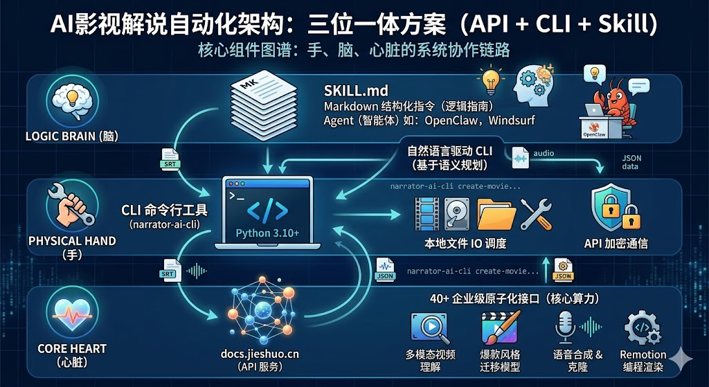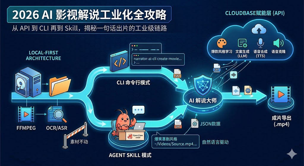 本文将分享一套基于 narrator-ai-cli 与 Skill 架构的自动化方案。该方案旨在通过一行命令或一段自然语言指令,打通从视频理解、文案生成到配音剪辑的完整闭环,实现影视解说场景的工业化落地。