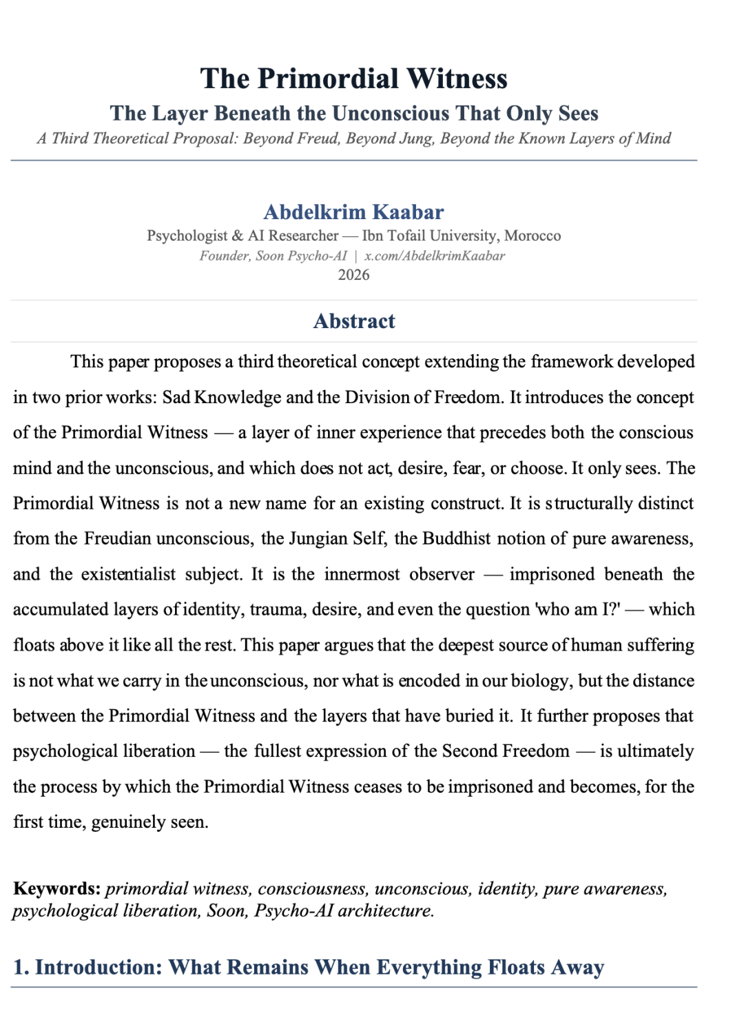 本文提出了第三个理论概念,扩展了先前两部作品《悲伤的知识》与《自由的划分》所构建的框架。它引入了“原始见证者”这一概念——一种先于意识心智与潜意识的内在经验层面,它不行动、不欲望、不恐惧、也不选择。它仅仅观看。原始见证者并非对既有概念的新命名。它在结构上区别于弗洛伊德式的潜意识、荣格式的自体、佛教中的纯粹觉知观念,以及存在主义式的主体。它是最内在的观察者——被囚禁在积累起来的身份、创伤、欲望,甚至“我是谁?”这个问题(这一问题如同其他一切一样漂浮于其上方)等诸层面之下。本文主张,人类痛苦的最深来源,既非我们潜意识的承载之物,亦非编码于我们生物学中的东西,而是原始见证者与将其掩埋的诸层面之间的距离。本文进一步提出,心理上的解放——即第二自由的最充分表达——归根到底是这样一个过程:原始见证者不再被囚禁,并首次被真正地看见。