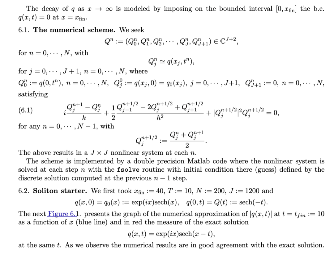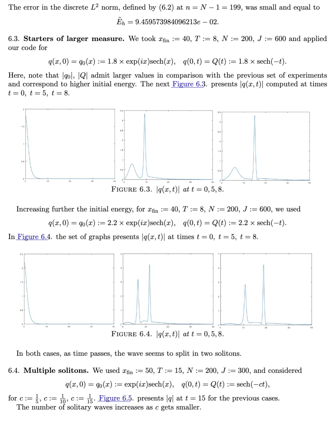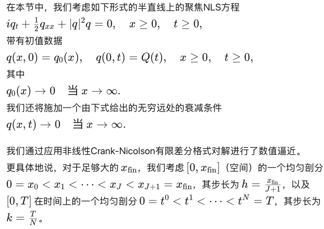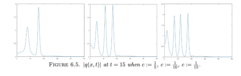 如果没有孤子存在,在聚焦情形下也成立一个非常相似的渐近公式(这在 [1] 中对于零初值数据和小 Dirichlet 数据已被证明为真)。然而,一般情况下,假设统一理论适用,人们将不得不加上一组孤子项的和。在长时间下,这些孤子会分离,最高的也是最快的。因此,对于一组有限的特定 x/t值(对应于孤子速度),主导渐近项由一个 1-孤子公式给出,其参数依赖于对应于给定(初值和 Dirichlet)数据以及 Neumann 值的散射系数!关于实际细节,参见 [15] 的附录 B。当然,如果我们不知道如何控制 Neumann 值——而目前我们确实不知道——就没有什么被严格证明。充其量我们可以提供一些令人信服的数值结果来表明情况确实如此:渐近性由一组有限个向右传播的孤子和一个衰减项给出。这正是我们在第 6 节中所做的。