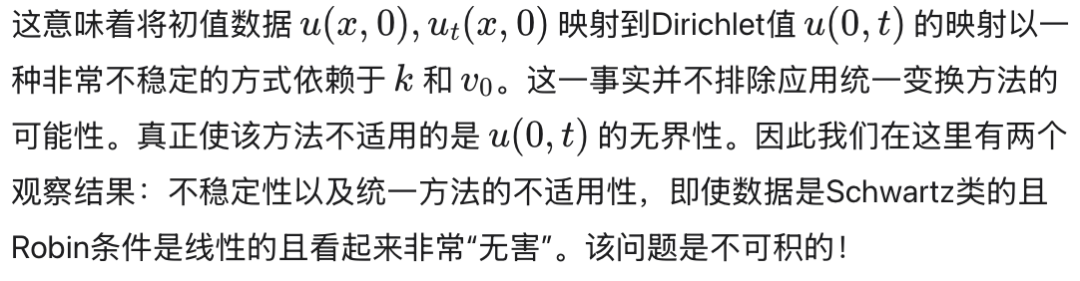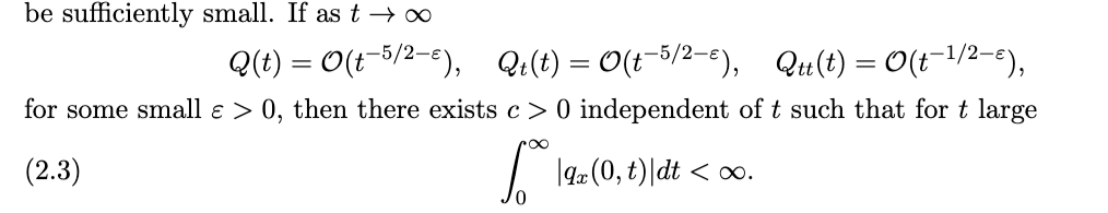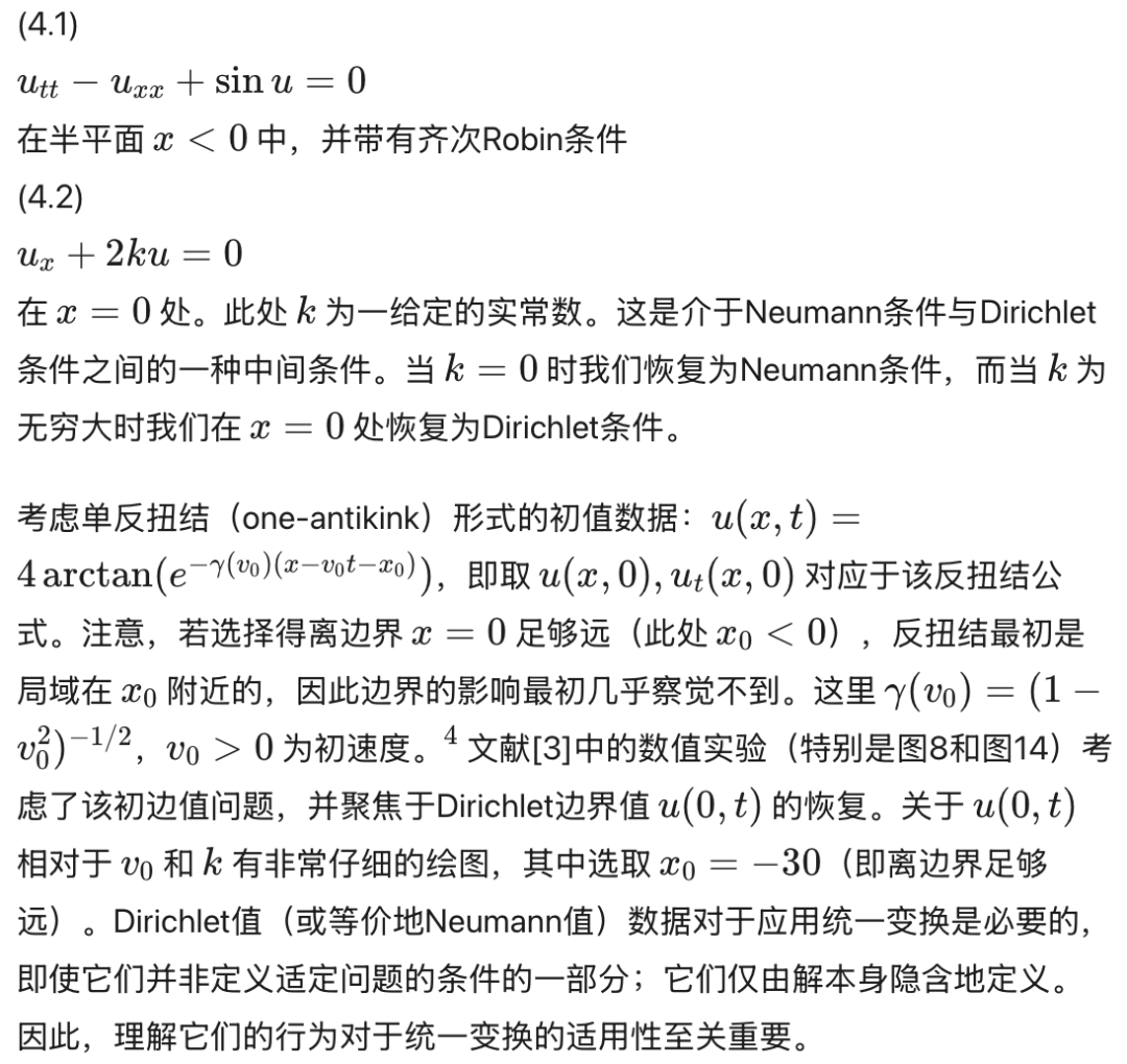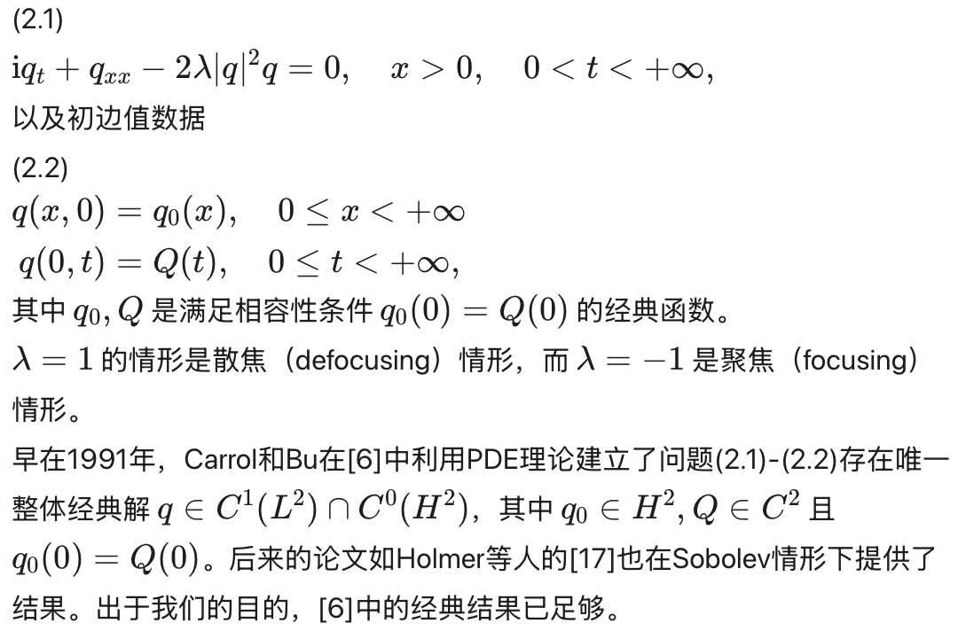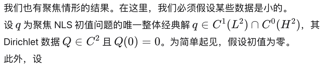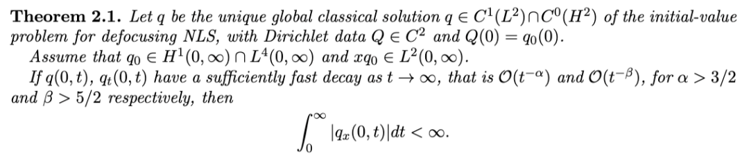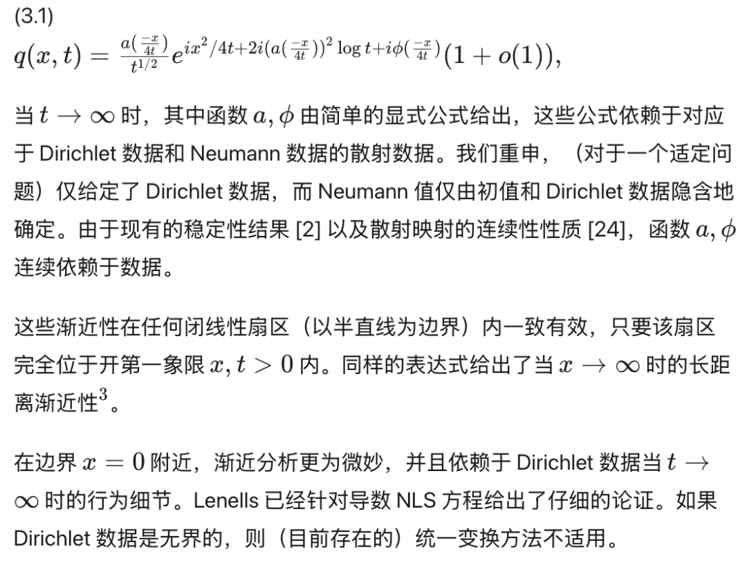 在[15]中,作者利用统一变换方法(unified transform method)求解实正半轴上的问题,给定了初值和Dirichlet数据(这使得问题适定)以及Neumann值 P(t):=qx(0,t)。该理论运作所要求的是Neumann函数(以及Dirichlet数据)属于某个具有良好衰减性质的类,以便统一散射变换能够被恰当定义。这正是我们要给出的定理的内容:我们提供了几个相当包容的大类Dirichlet数据,使得Dirichlet和Neumann值在 t→∞ 时衰减得足够快,从而散射方法可以运作。因此[15]适用,Riemann-Hilbert分解问题是可能的,并且显式渐近公式(长时间[15]、长空间,甚至是半经典[18][16])是可用的。这些公式不如Cauchy问题的公式有效。原因是通常情况下Dirichlet-to-Neumann映射是非常隐含的。因此,出现在渐近公式中的一些函数涉及与Neumann边界值相关的散射数据;这些无法被有效计算。尽管如此,这里的Dirichlet-to-Neumann映射是连续的;在后面的章节中,我们将考虑依赖性可能非常不稳定的更复杂问题。