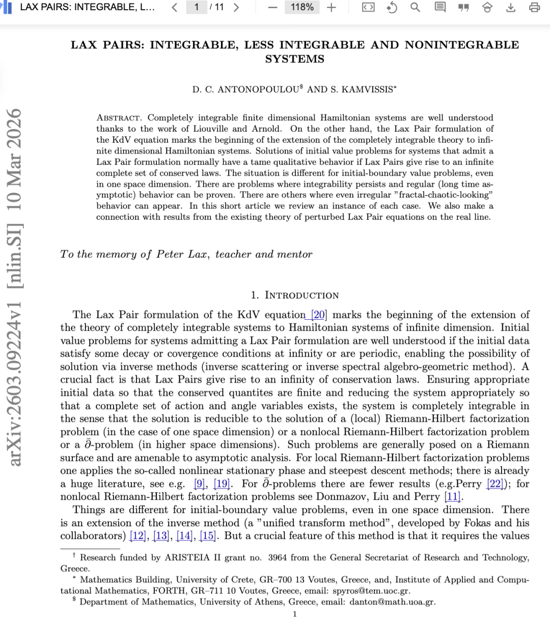 另一方面,众所周知[23],具有三次非线性的非线性薛定谔方程(NLS)可以写成Lax对的形式,并且至少Cauchy问题是“完全可积”的;这意味着存在无穷多个处于Poisson对合(Poisson involution)中的守恒律,此外该问题可以通过散射变换线性化。这并不意味着存在真正的显式解(bona fide explicit solution)。充其量,反散射问题(重写为Riemann-Hilbert分解问题)可以进行有效的渐近处理。可以提供有效的长时间、长距离和半经典渐近公式:它们要么非常显式地依赖于初值,最坏情况下也仅通过求解简单的线性常微分方程组(ODEs)来依赖。