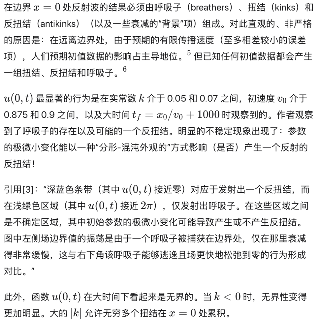 在第四节中,我们展示了Arthur、Dorey和Parini进行的一些精美的数值实验,这些实验清楚地表明,具有初值和Robin边界条件的Sine-Gordon初边值问题的行为中存在不规则性。此外,Dirichlet边界函数 u(x,0) 似乎是无界的。这是一个清晰的实例,说明某个允许Lax对表述的问题却不可积:添加边界和边界条件,即使确保问题唯一可解,也可能保持或不保持可积性!