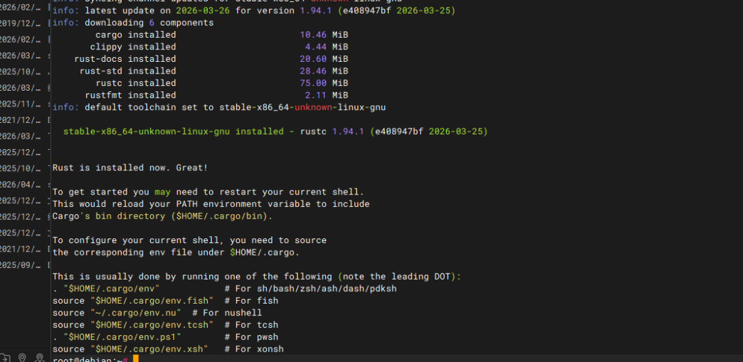 除了Rust,你还得有一些基础的编译工具,比如gcc、make之类的。debain13的话可以这样装: