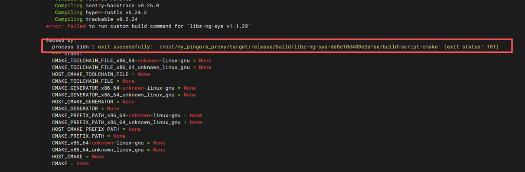 出现报错,处理下,简单来说:你的 Linux 系统中没有安装 cmake,或者 cmake 不在系统的环境变量路径中。由于 libz-ng-sys 这个库(它是 Pingora 的依赖之一)需要通过 cmake 来编译 C 代码,所以报错了。(感谢ai)