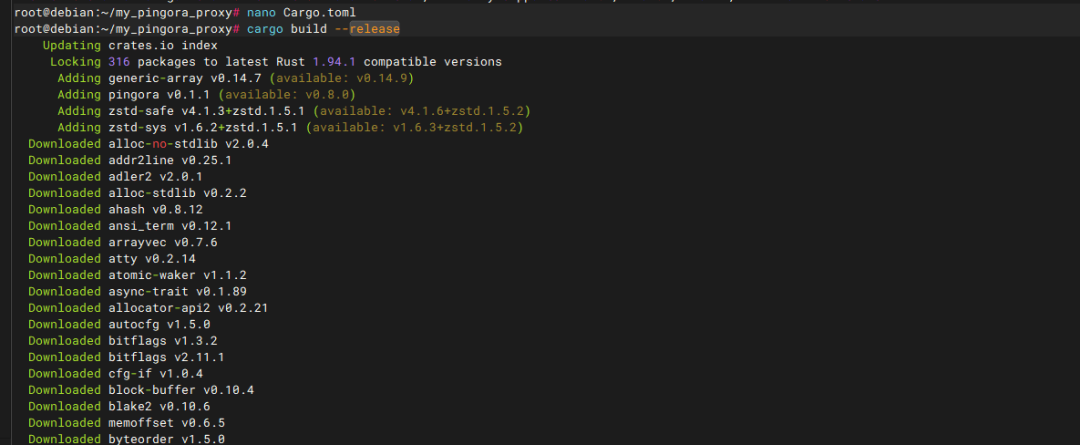 Pingora是用Rust写的,所以首先你得有Rust的环境。要是你系统里还没有Rust,那就得先装一下。我这边测试用的是debain13,其他Linux发行版应该也差不多。