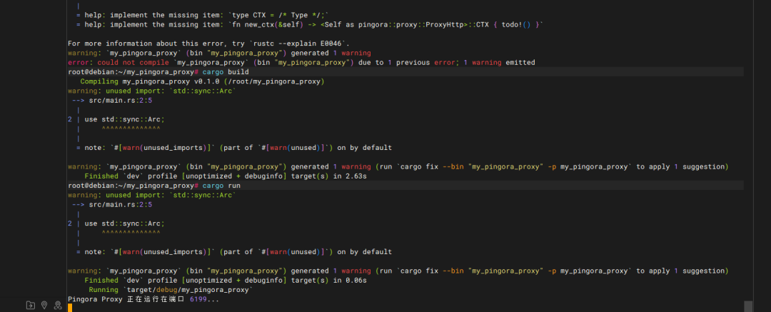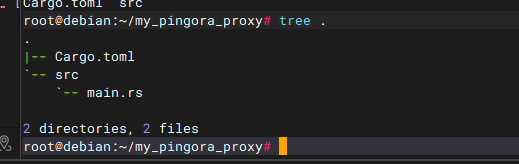 环境准备好了,接下来就是创建项目。Pingora不是一个独立的可执行程序,而是一个框架,你需要基于它来开发自己的代理服务。这个跟Nginx不太一样,Nginx是直接装好就能用的,Pingora更像是一个开发框架。