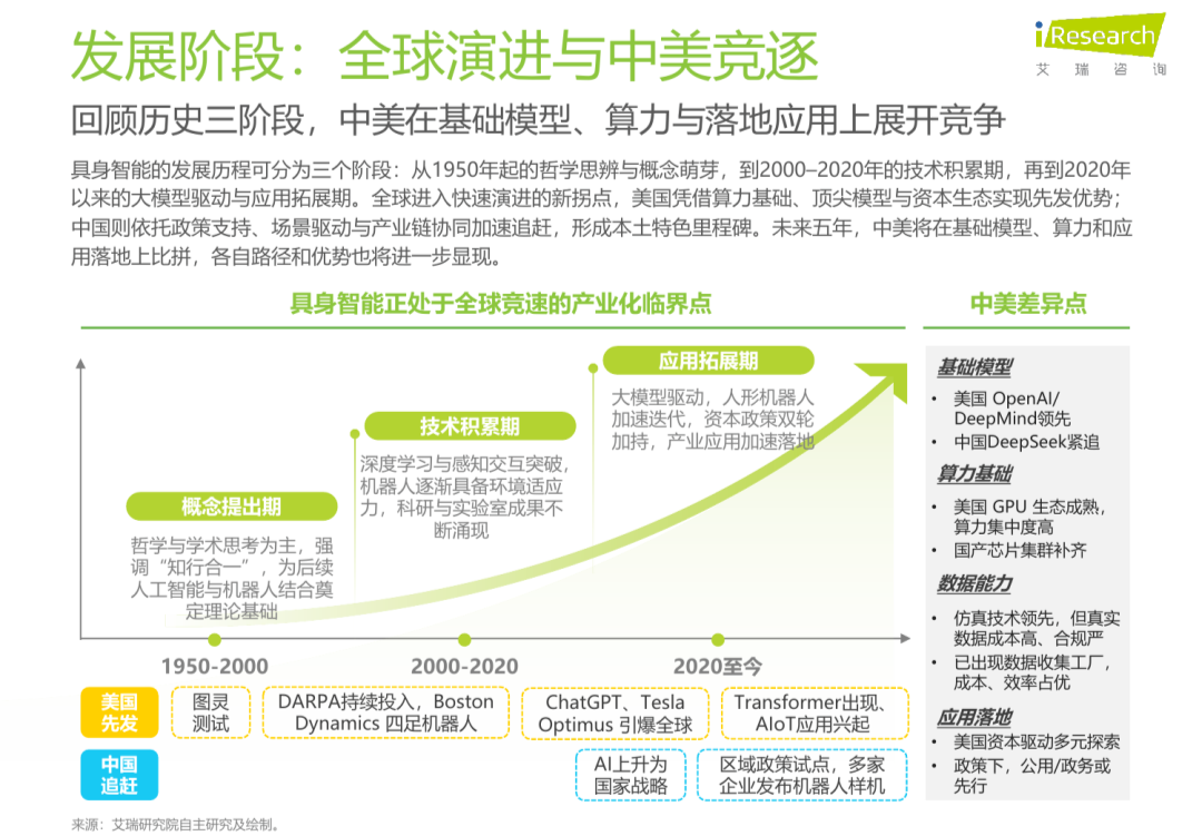 具身智能的发展历程可分为三个阶段:1950-2000年的概念提出期,以哲学与学术思考为主;2000-2020年的技术积累期,深度学习与感知交互取得突破;2020年至今的应用拓展期,大模型驱动人形机器人加速迭代,资本政策双轮加持,产业应用加速落地。