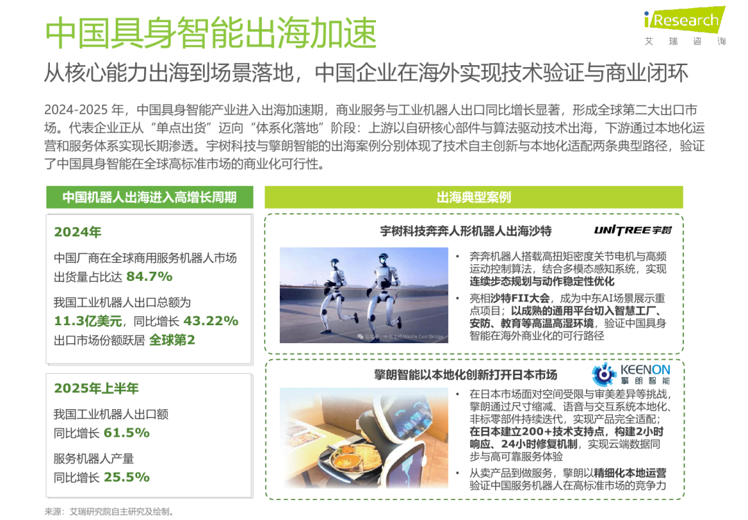 代表企业正从“单点出货”迈向“体系化落地”阶段:上游以自研核心部件与算法驱动技术出海,下游通过本地化运营和服务体系实现长期渗透。宇树科技与擎朗智能的出海案例分别体现了技术自主创新与本地化适配两条典型路径,验证了中国具身智能在全球高标准市场的商业化可行性。