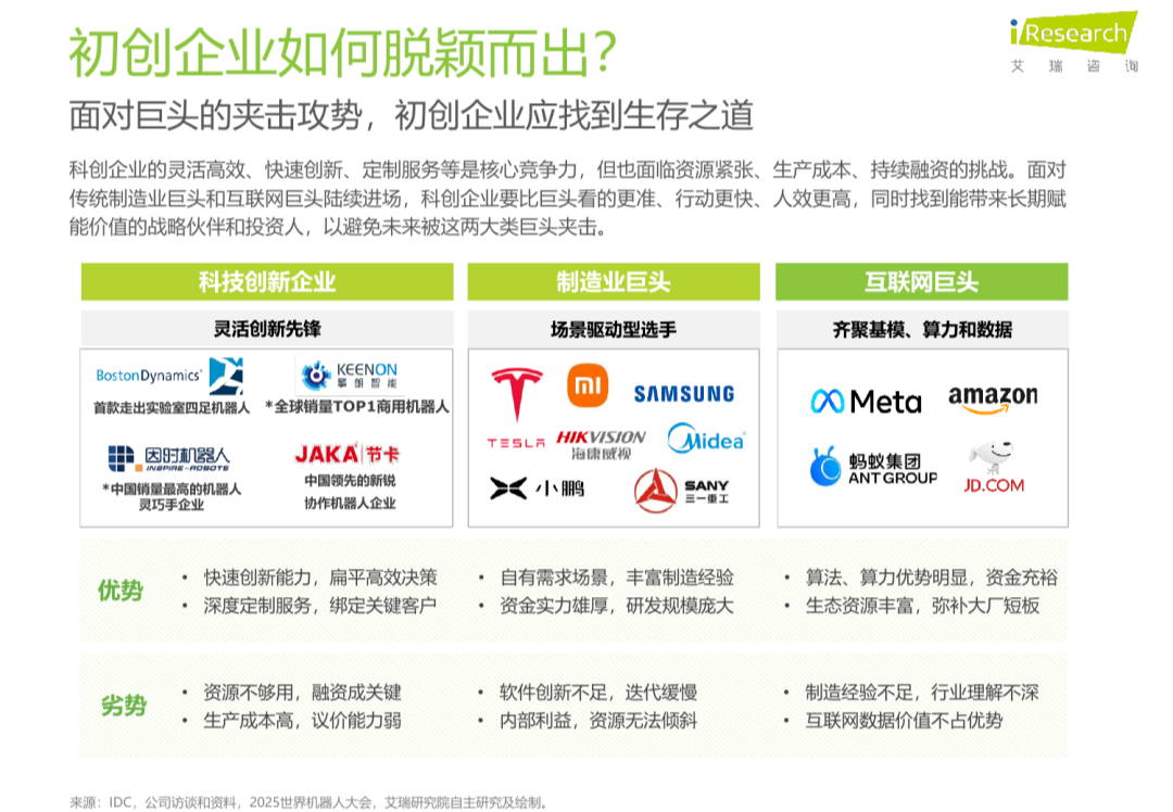 制造业巨头的优势在于自有需求场景和丰富制造经验、资金实力雄厚、研发规模庞大,但软件创新不足、迭代缓慢。互联网巨头的优势在于算法、算力和生态资源,但制造经验不足、行业理解不深。初创企业需要在夹缝中找到差异化竞争路径。