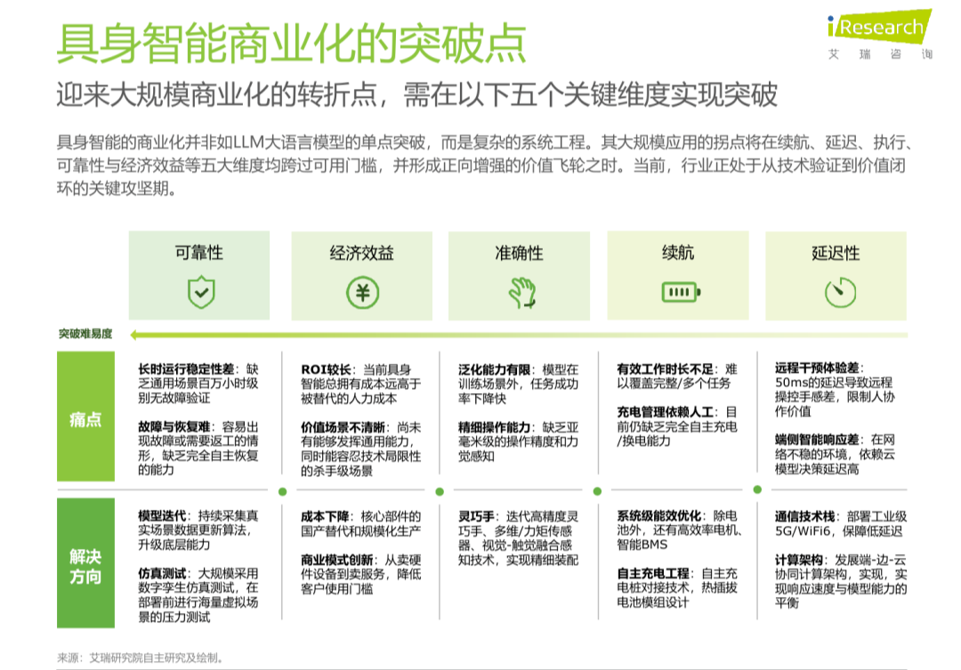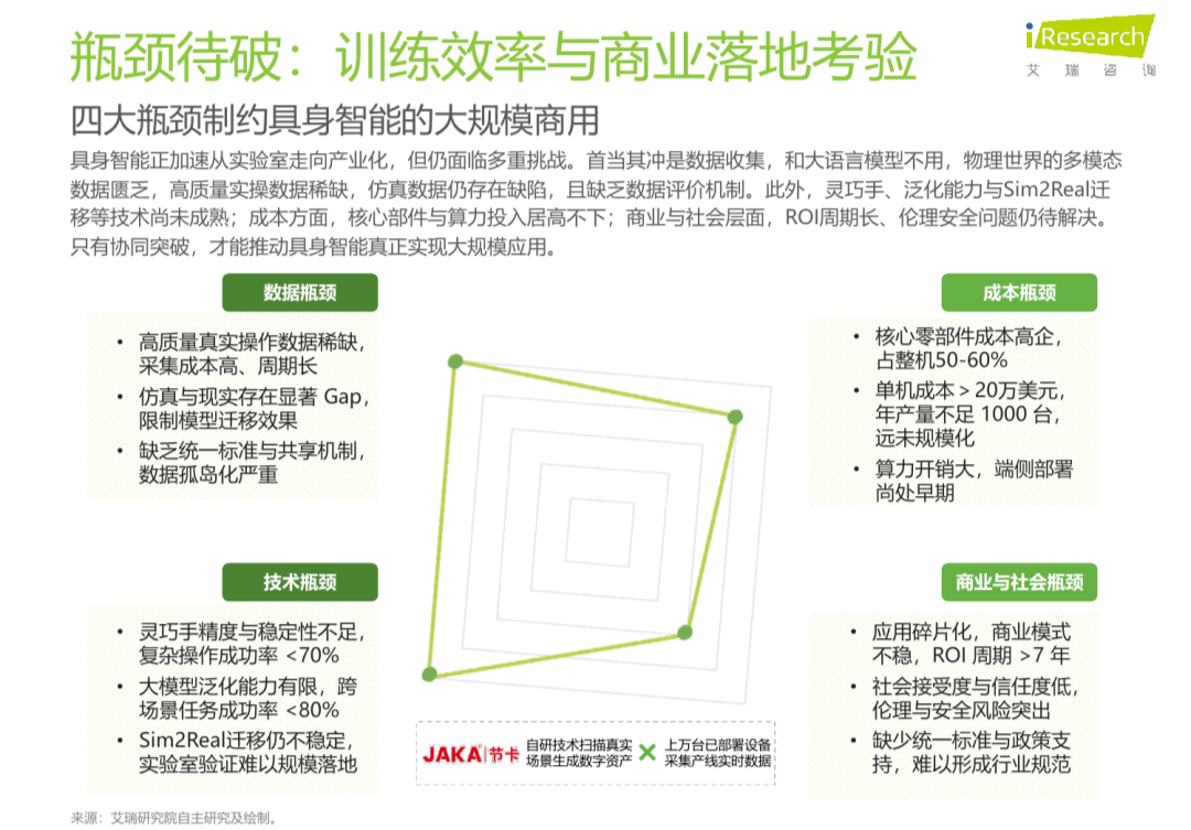具体而言:续航方面,有效工作时长不足,难以覆盖完整/多个任务,充电管理依赖人工;延迟方面,50ms的延迟导致远程操控手感差,端侧智能响应差;准确性方面,泛化能力有限,模型在训练场景外任务成功率下降快;可靠性方面,长时运行稳定性差,缺乏通用场景百万小时级别无故障验证;经济效益方面,ROI较长,当前具身智能总拥有成本远高于被替代的人力成本。