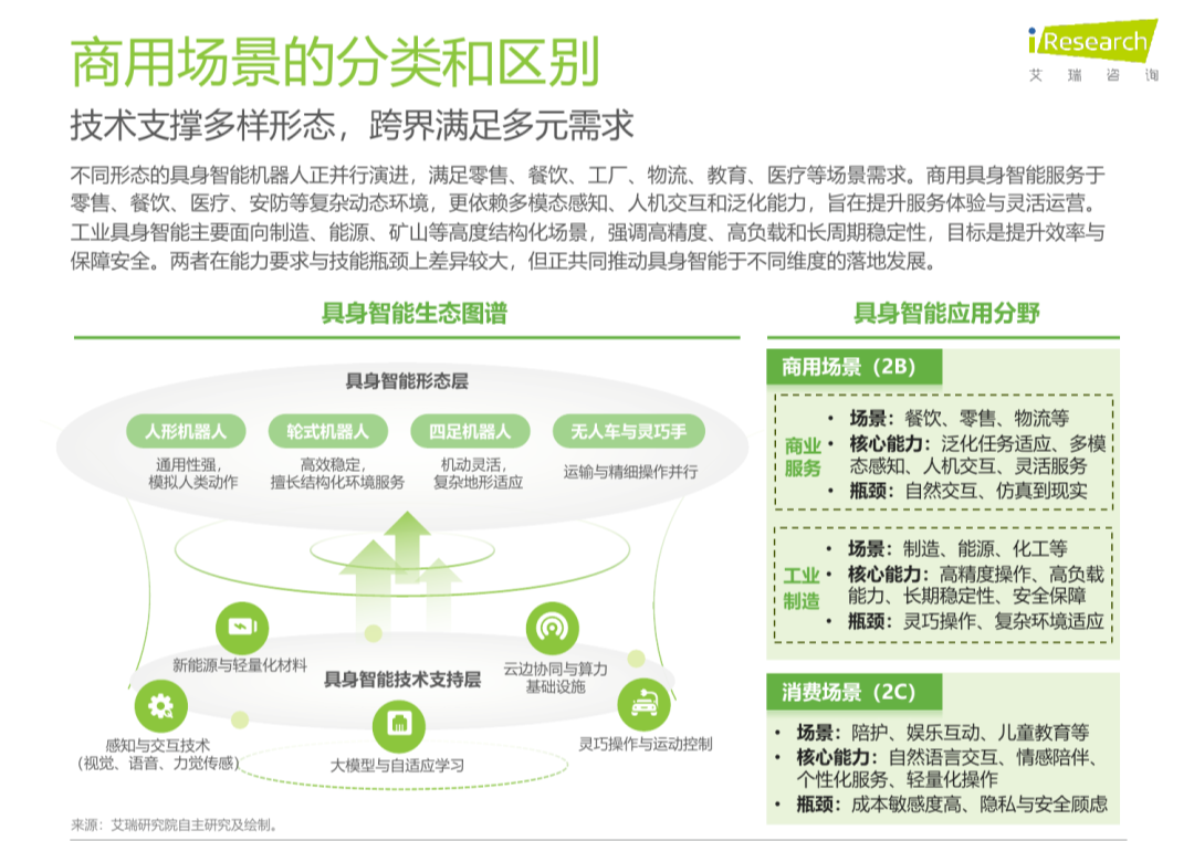 不同形态的具身智能机器人正并行演进,满足零售、餐饮、工厂、物流、教育、医疗等多元场景需求。商用具身智能主要服务于零售、餐饮、医疗、安防等复杂动态环境,更依赖多模态感知、人机交互和泛化能力,旨在提升服务体验与灵活运营。工业具身智能则主要面向制造、能源、矿山等高度结构化场景,强调高精度、高负载和长周期稳定性,目标是提升效率与保障安全。